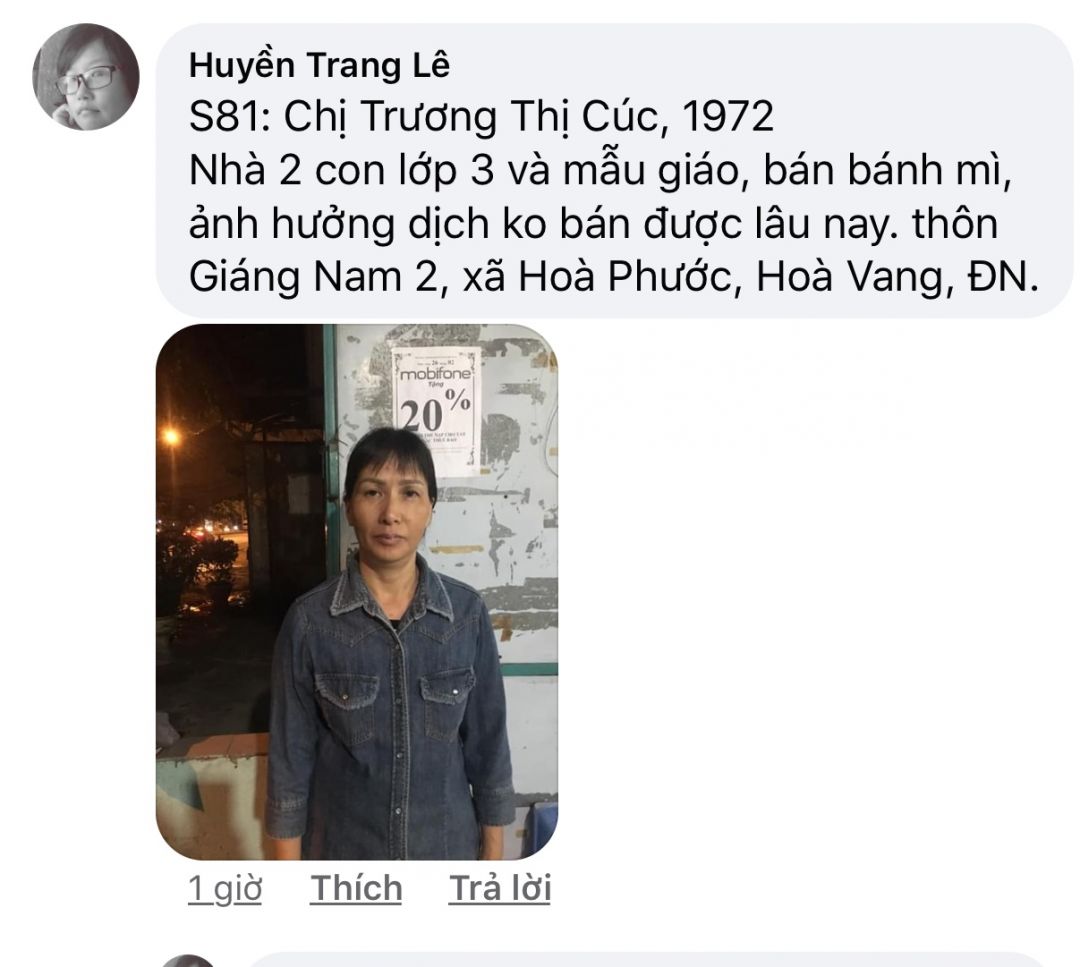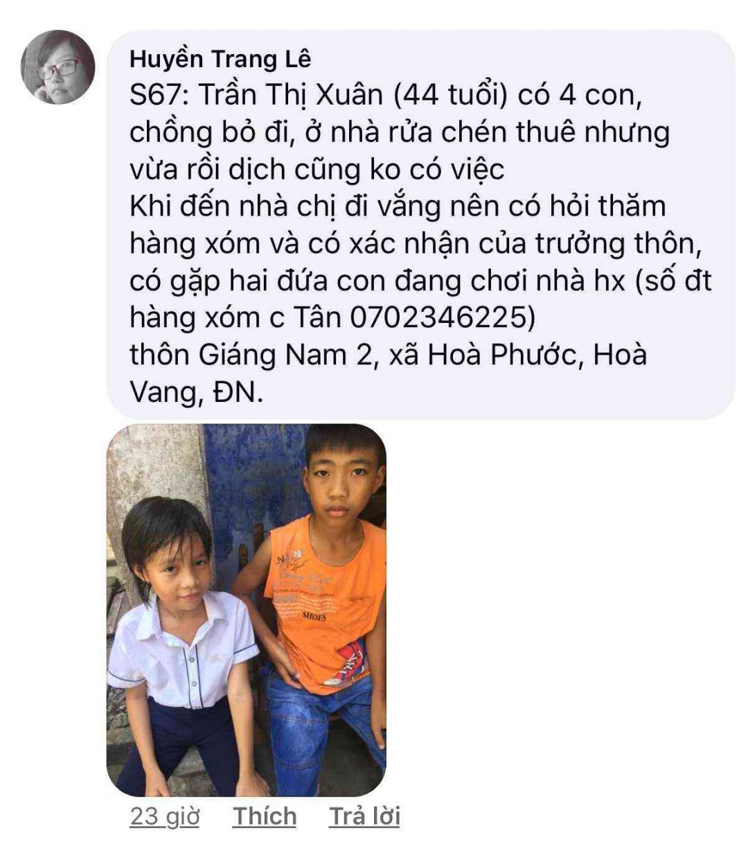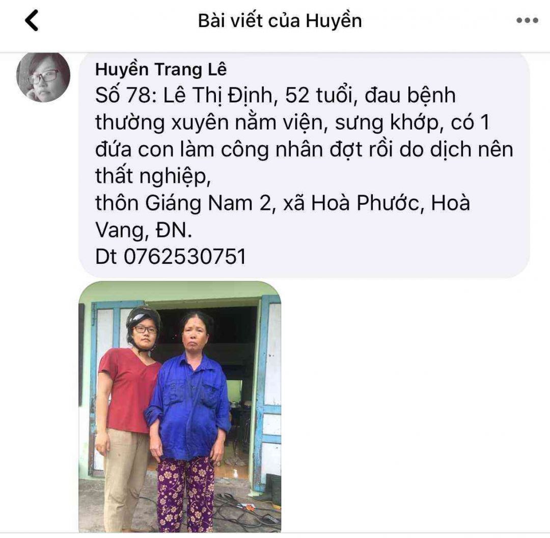 Số 79: Chị Trần Thị Định, 40 tuổi, thôn Giáng Nam 2, xã Hoà Phước, Hoà Vang, ĐN. Bị tâm thần nhẹ, bt vẫn đi làm công nhân Khu công nghiệp Hoà Khánh nhưng do dịch nên nghỉ mấy tháng nay chưa đi làm lại, 4 đứa con, con đầu 20 tuổi bị thần kinh, ko có chồng