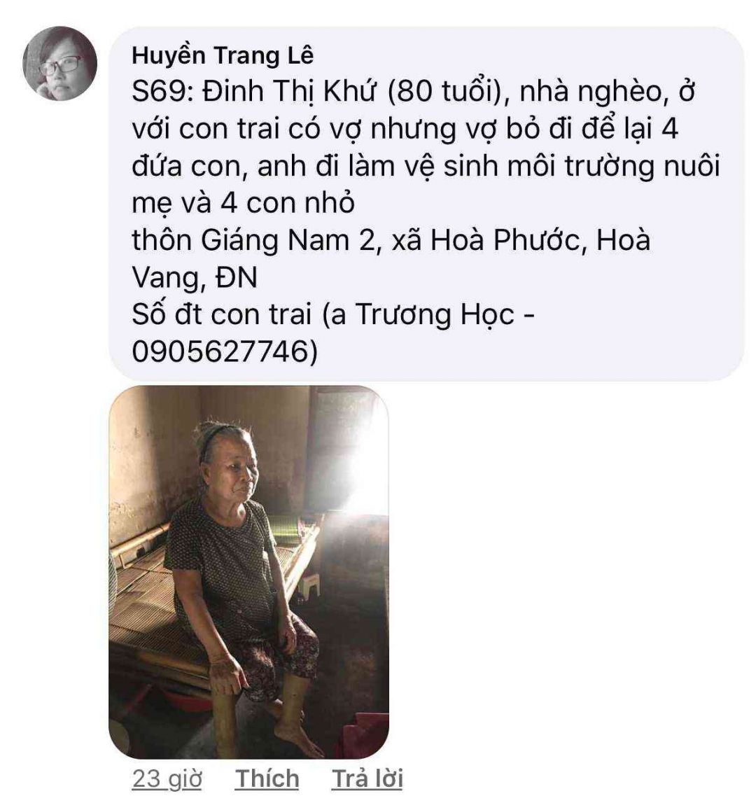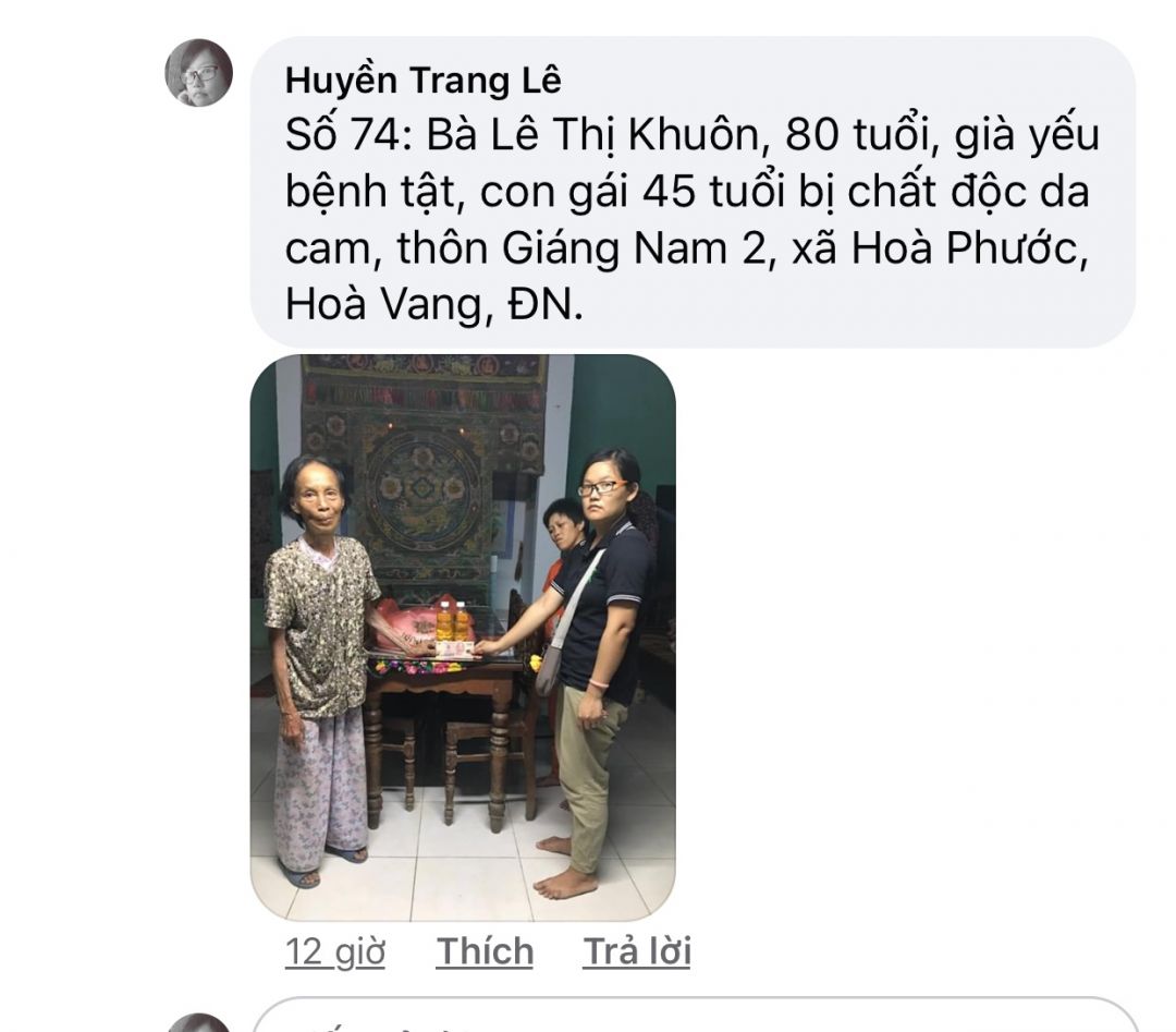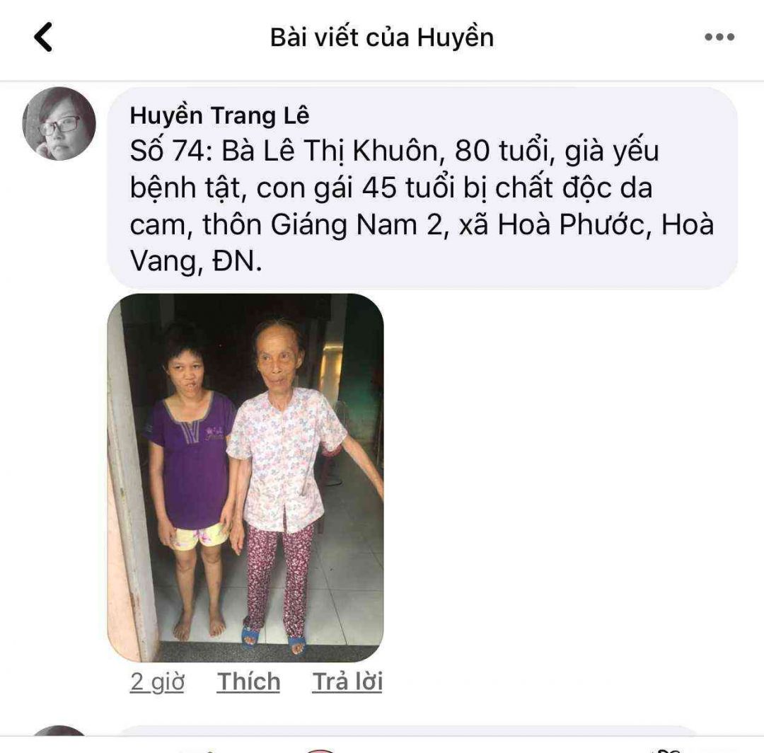 Số 74: Bà Lê Thị Khuôn, 80 tuổi, già yếu bệnh tật, con gái 45 tuổi bị chất độc da cam, thôn Giáng Nam 2, xã Hoà Phước, Hoà Vang, ĐN.