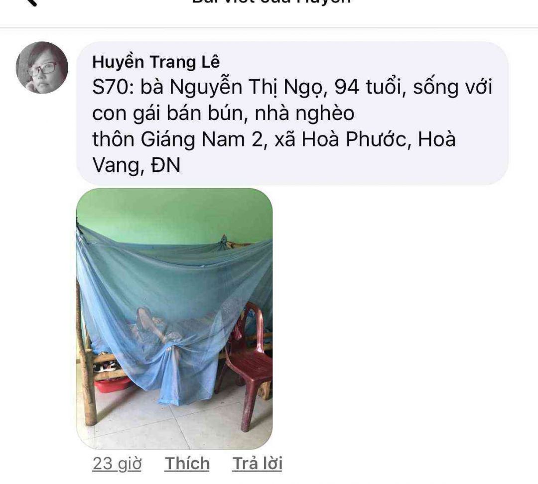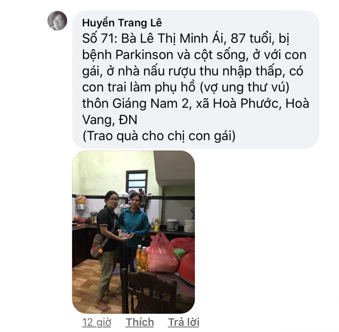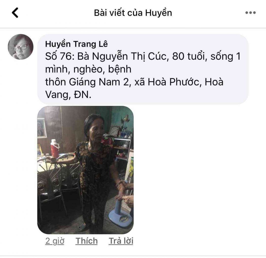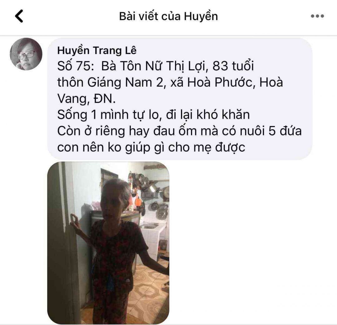 Số 74: Bà Lê Thị Khuôn, 80 tuổi, già yếu bệnh tật, con gái 45 tuổi bị chất độc da cam, thôn Giáng Nam 2, xã Hoà Phước, Hoà Vang, ĐN.