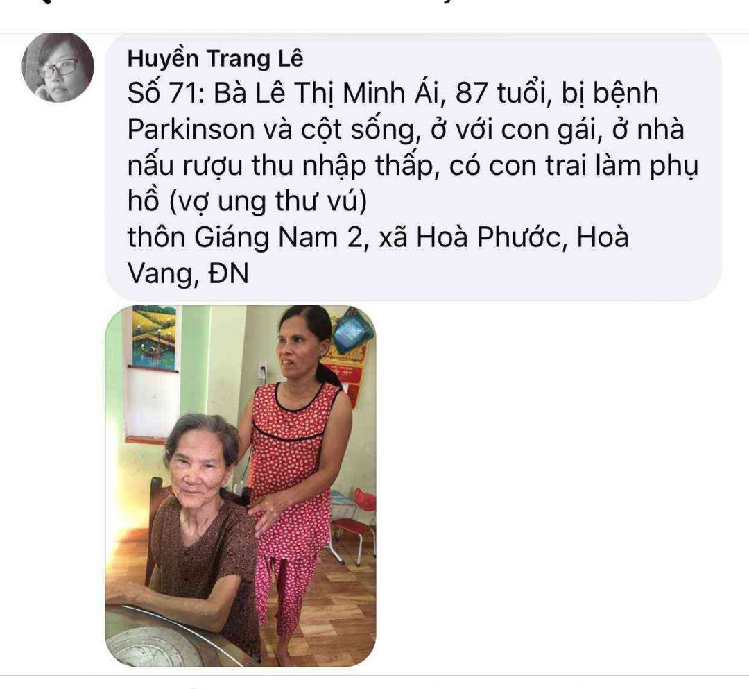 Số 71: Bà Lê Thị Minh Ái, 87 tuổi, bị bệnh Parkinson và cột sống, ở với con gái, ở nhà nấu rượu thu nhập thấp, có con trai làm phụ hồ (vợ ung thư vú)