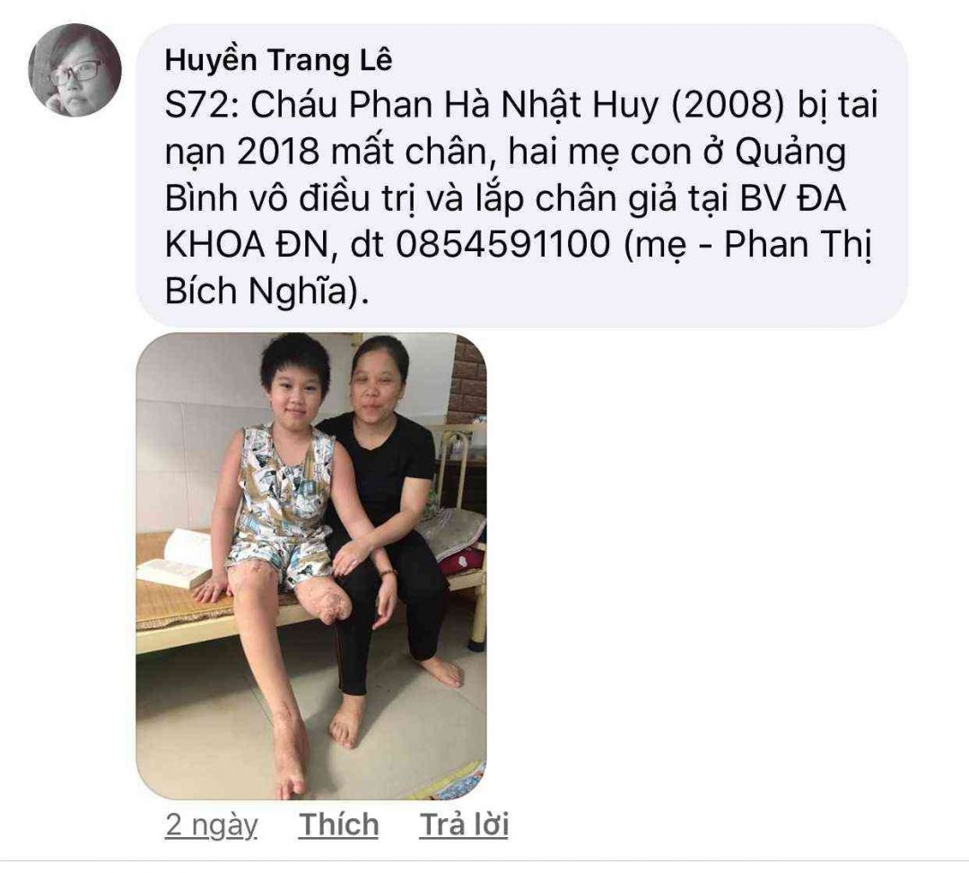 Số 72: Cháu Phan Hà Nhật Huy (2008) bị tai nạn 2018 mất chân, hai mẹ con ở Quảng Bình vô điều trị và lắp chân giả tại BV ĐA KHOA ĐN, dt 0854591100 (mẹ - Phan Thị Bích Nghĩa). Đang ở trọ tại 2/98 Quang trung, ĐN