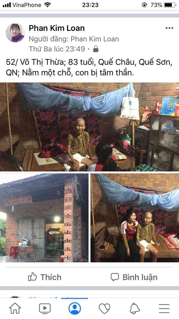57/ Phan Thị Hoàng; 65 tuổi; Quế Thuận, quế sơn, quảng nam; bị tâm thần, sống một mình đơn thân