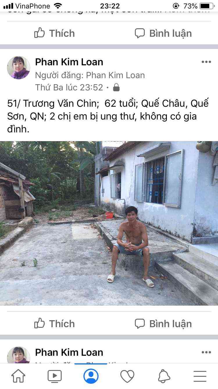 51/ Trương Văn Chin;  62 tuổi; Quế Châu, Quế Sơn, QN; 2 chị em bị ung thư, không có gia đình.