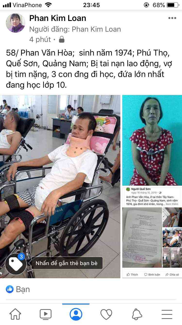 58/ Phan Văn Hòa;  sinh năm 1974; Phú Thọ, Quế Sơn, Quảng Nam; Bị tai nạn lao động, vợ bị tim nặng, 3 con đng đi học, đứa lớn nhất đang học lớp 10.