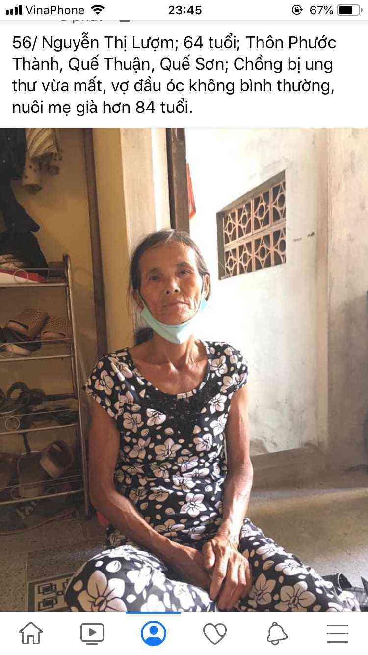 56/Nguyễn Thị Lượm; 64 tuổi; Thôn Phước Thành, Quế Thuận, Quế Sơn; Chồng bị ung thư vừa mất, vợ đầu óc không bình thường, nuôi mẹ già hơn 84 tuổi.