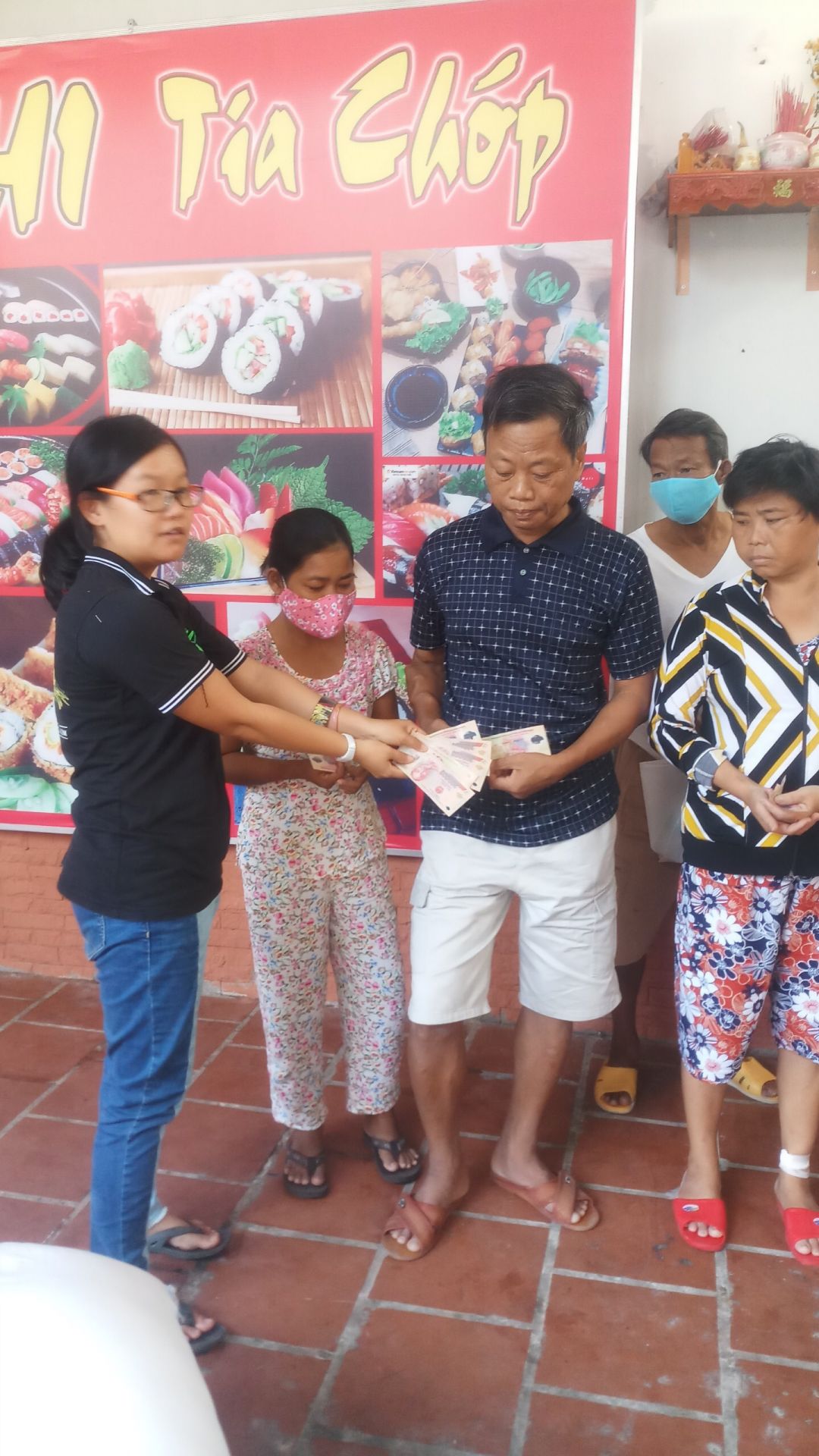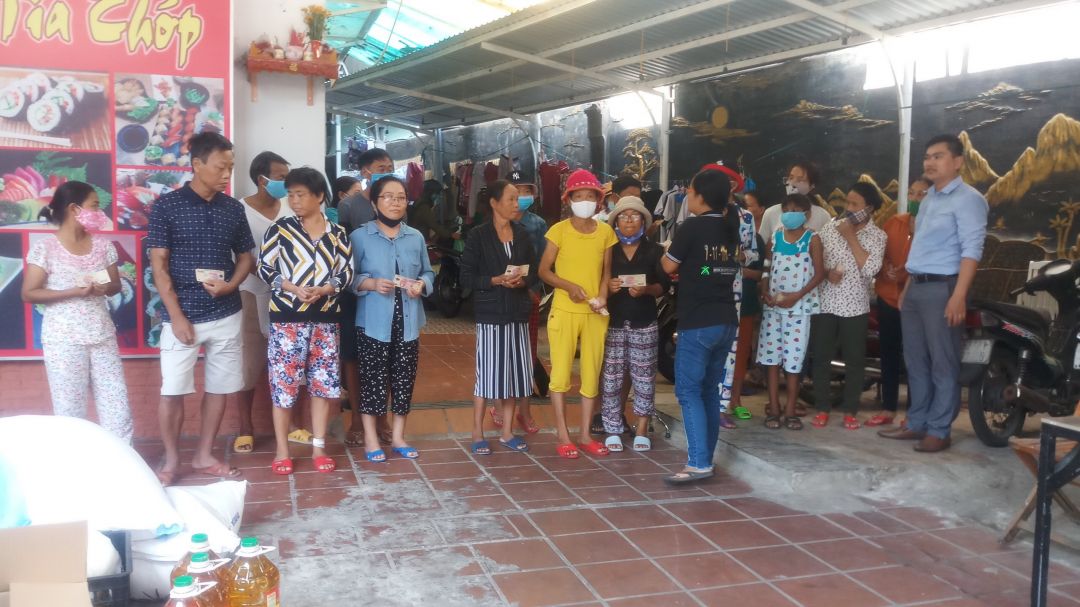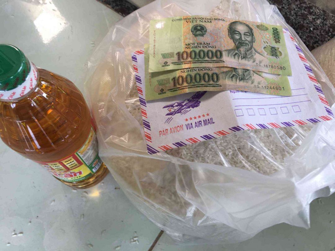 (23 suất quà tương đương 230kg gạo + 23 lít dầu ăn, họ nấu ăn chung nên sau khi hỏi thì đã để nguyên gạo và dầu ăn họ tự chia nhau, tiền mặt phát trực tiếp cho từng người, thiếu 5 người tại thời điểm đến đang ở BV nên đã gửi lại cho chú Tiến trưởng nhóm 1 triệu đồng để gửi lại cho họ)
