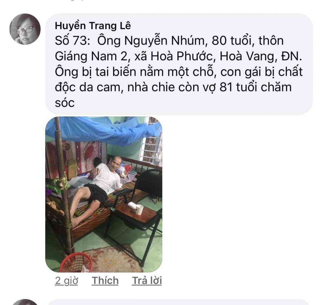 Số 73:  Ông Nguyễn Nhúm, 80 tuổi, thôn Giáng Nam 2, xã Hoà Phước, Hoà Vang, ĐN. Ông bị tai biến nằm một chỗ, con gái bị chất độc da cam, nhà chie còn vợ 81 tuổi chăm sóc