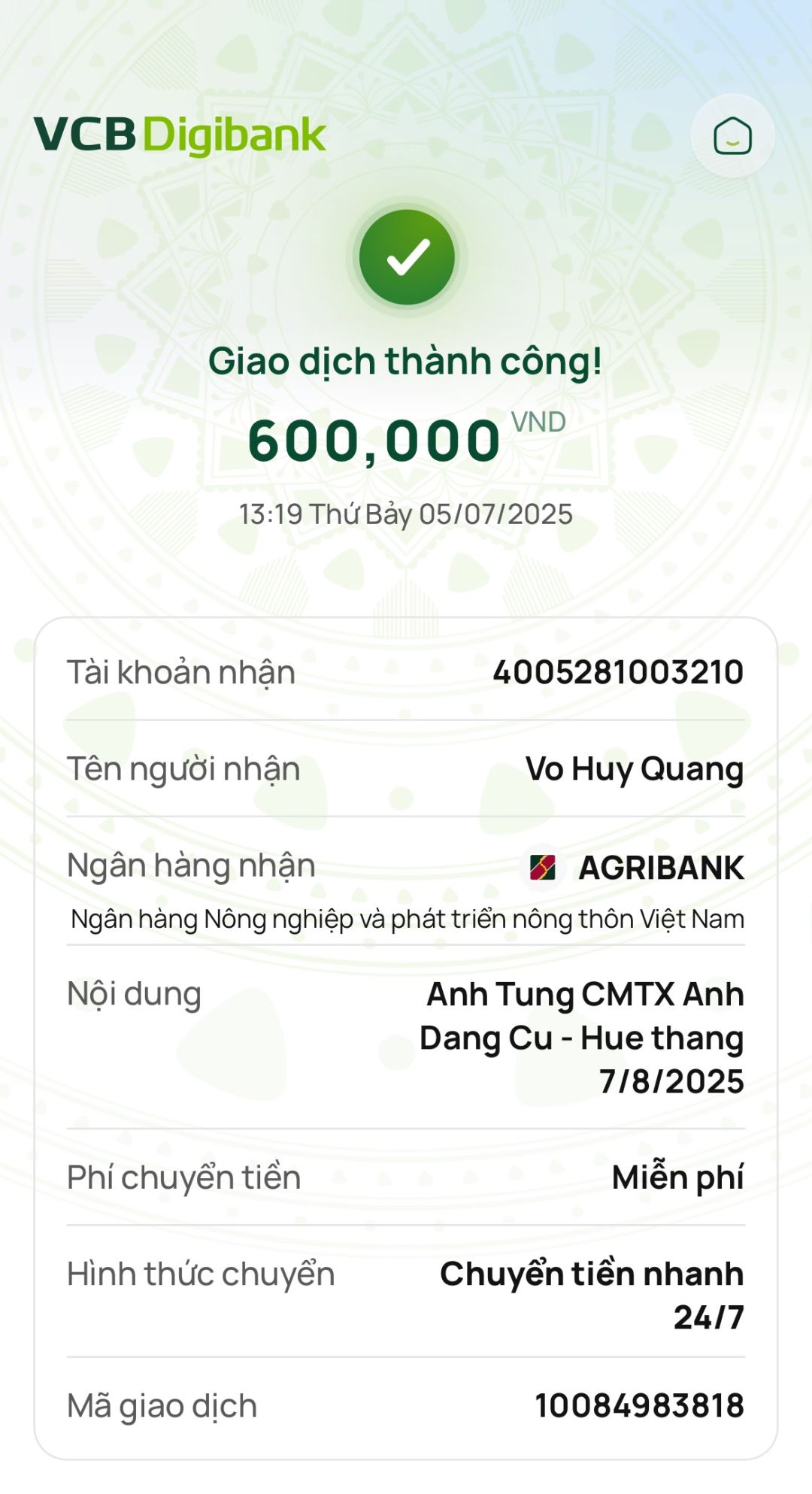Tieuhuongduong đã chuyển 600.000đ hai tháng 9,10/2025, nhờ bạn trung chuyển giúp nhé.