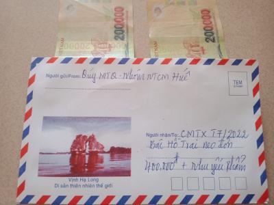 Hôm nay (13/4/2022) Quang đã chuyển quà CMTX tháng 4/2022 là số tiền 400.000đ đến với bác Hồ Trai. Nhận được quà bác rất mừng và gửi lời cảm ơn sâu sắc đến với quý MTQ và Nhóm NTCM Huế ạ!