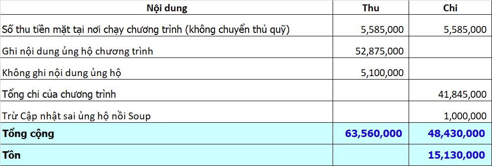 Như vậy chúng ta chốt lại số tiền tồn quỹ sau khi thực hiện chương trình là 15,130,000₫ các bạn nhé.