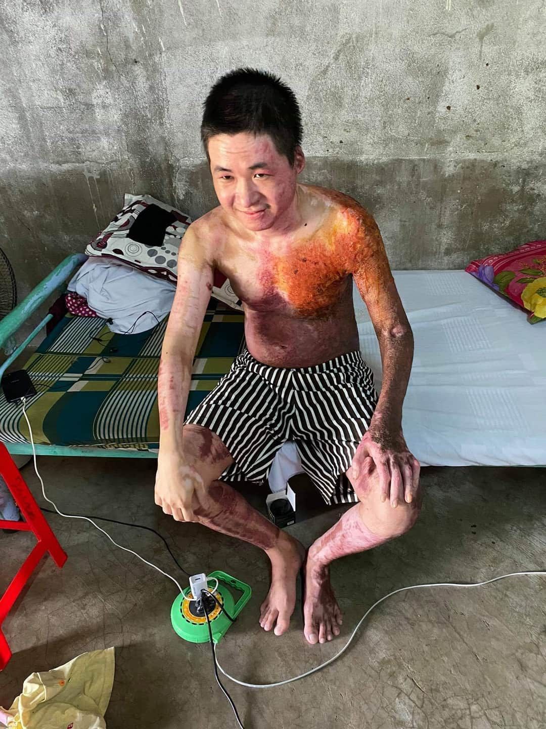 Em Tiến, 20t, và mẹ em bị người ta tạt xăng vào phòng trọ. Mẹ em đã chết. Em bị phỏng toàn thân, biến dạng, lở loét đau nhức khắp người. Em lại bị bệnh tim, sức khỏe yếu. Hiện dì ruột đang chăm sóc em. Tất cả giấy tờ chữa trị, công an đang tạm giữ để điều tra vụ án. Người gây án đang bị giam. Chi phí chữa trị ở BV (theo dì em nói): 194tr. MTQ giúp 154tr, số còn lại là gia đình người thân giúp. Vụ án chưa được xét xử, chưa có sự bồi thường. Và hiện tại, em Tiến không nhận được đồng nào + lời thăm hỏi của gia đình người gây án. Người gây án có tình cảm với mẹ em, nhưng mẹ em từ chối nên người ấy trả thù (theo ý lời kể của em Tiến + dì ruột).