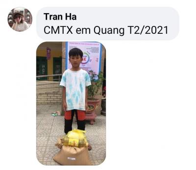 Vậy là đợt CMTX đến hoàn cảnh em Quang đã hết. Qua thăm hỏi, thì nhóm Huế xin được tiếp tục cưu mang hoàn cảnh em Quang bắt đầu từ T4/2021 với số tiền mua gạo và nhu yếu phẩm: 250.000đ/tháng