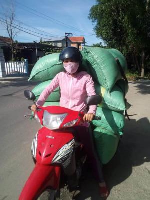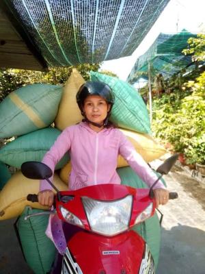 Với nghề nghiệp chủ yếu là thêu liễn ( các tấm liễn sử dụng trong các đám), một ngày cật lực chị thêu được 2 tấm với ngày công 50.000đ, chưa tính nguyên vật liệu thêu tự mua. Ngoài ra, chị còn chạy chở vỏ trấu để bán. Nói chung, những việc gì làm có thể kiếm thêm thu nhập cho gia đình chị chạy. Vì 1 mình nuôi 3 con nhỏ.