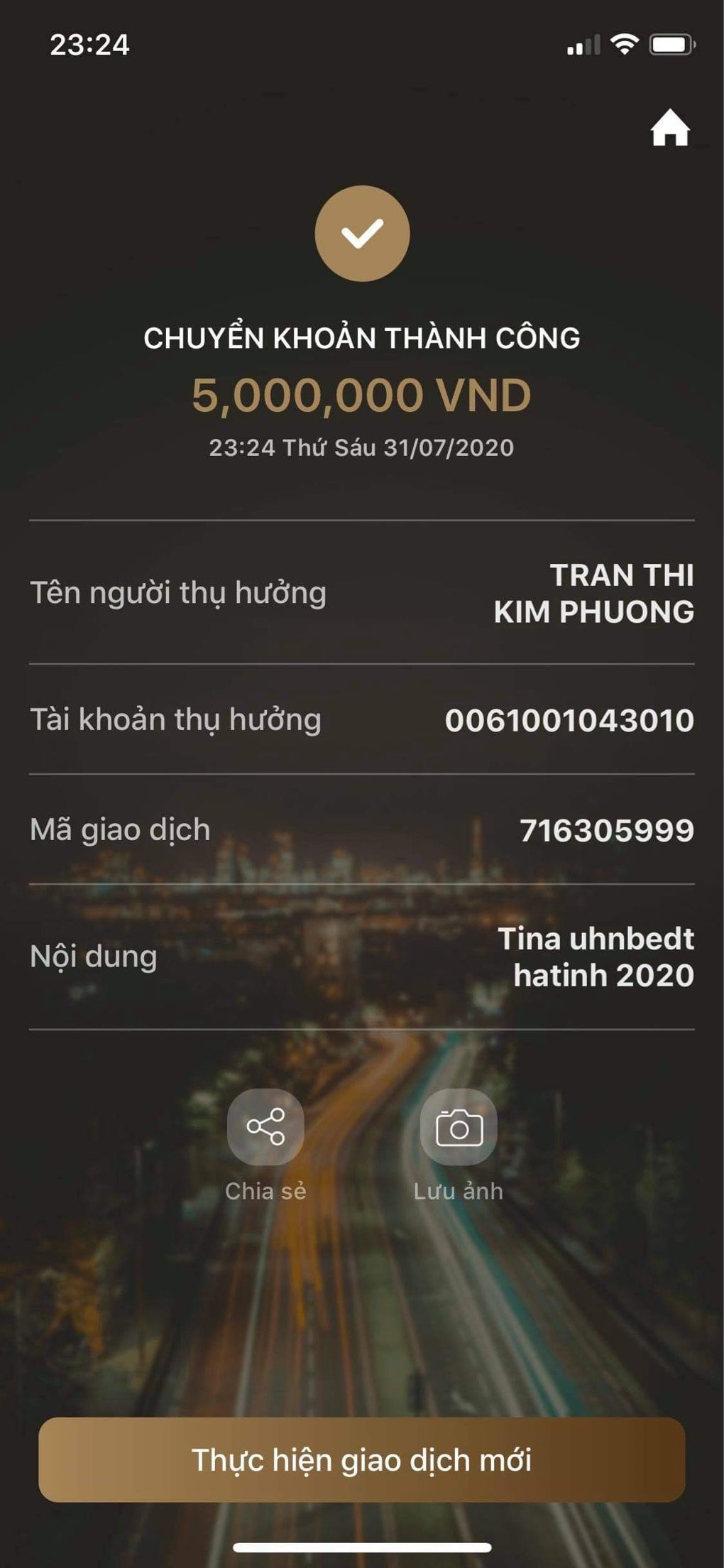 Số thứ tự 30 - Chị Tina đã chuyển khoản 5tr VND.