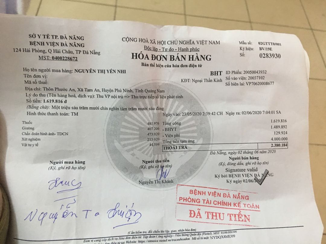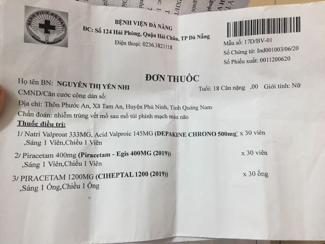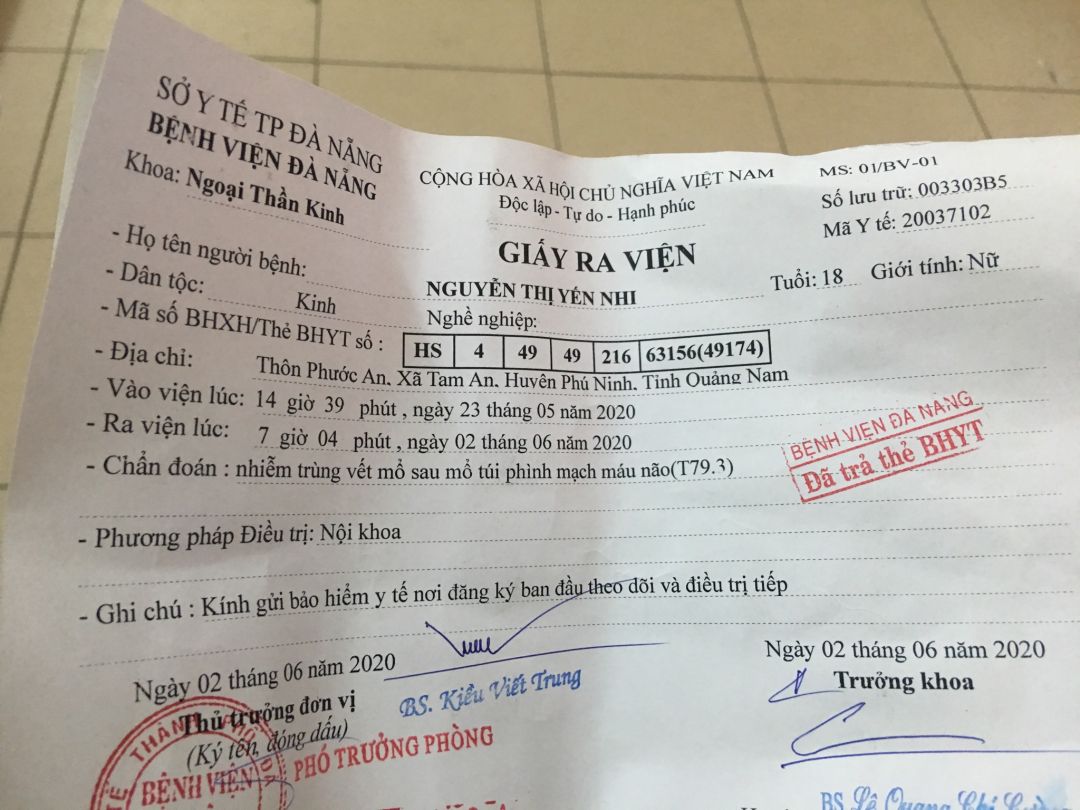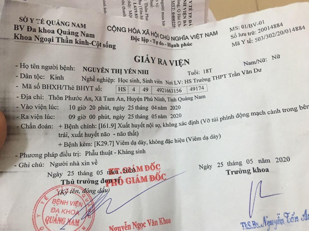 Qua hỏi thăm thì được biết em Yến Nhi đang đi học lớp 12, thường xuyên đau đầu nhưng ko để ý nghĩ đau đầu bình thường do em hay thức khuya học bài thôi, đến bữa do đau quá chịu không được mẹ em mới đưa em vào BV TAM KỲ thì bác sĩ cho nhập viện cấp cứu vì vỡ mạch máu não. Sau một thời gian điều trị thì người nhà xin ra BV ĐA KHOA ĐÀ NẴNG tiếp tục điều trị, đến 2/6 xuất viện về nhà uống thuốc.