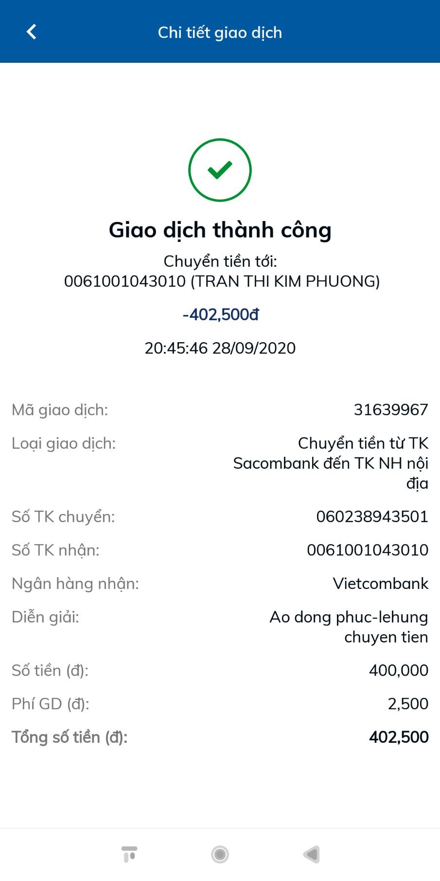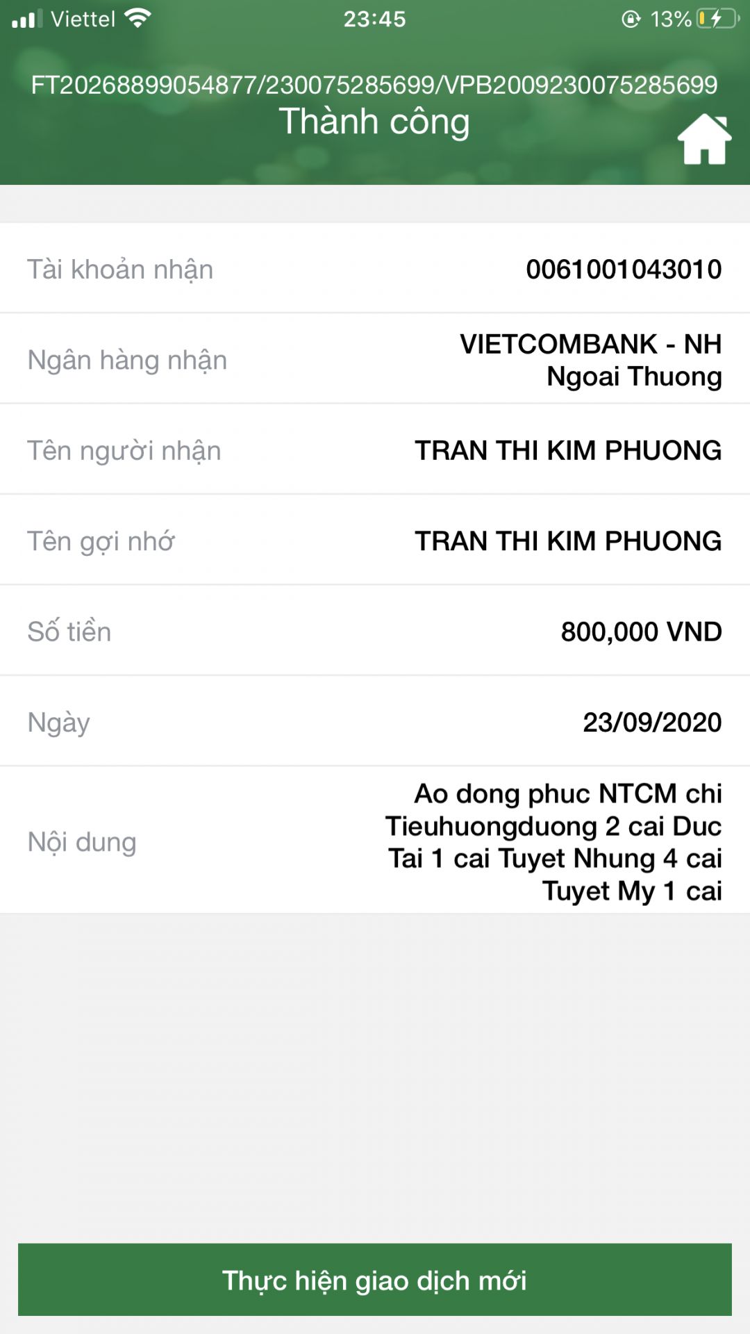 Loannguyen đã chuyển khoản tiền áo hôm nay nhận vào TK chị Thỏ con rồi ạ.