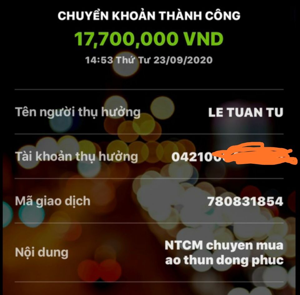 @Thocon : Em chuyển tới Letuantu 17,710,000đ để thanh toán nốt tiền áo thun nhé.