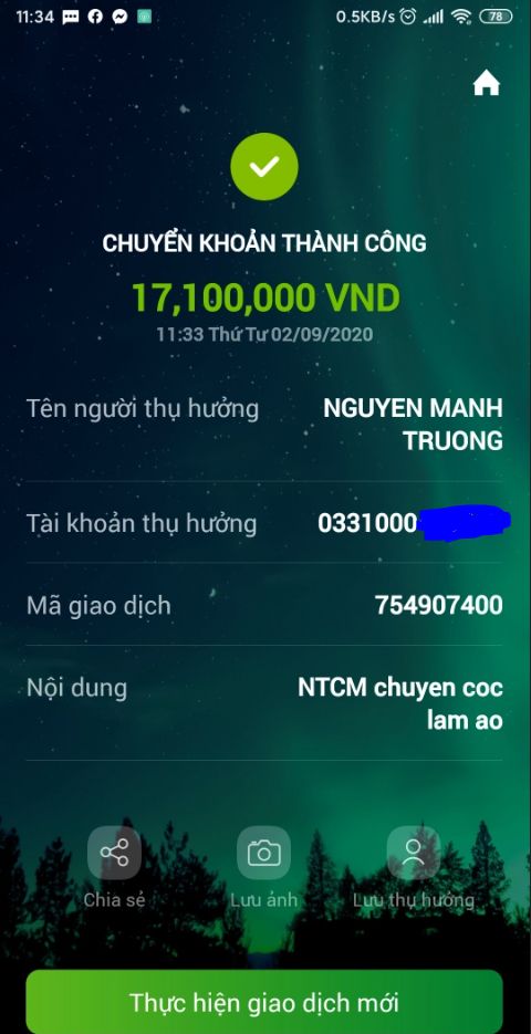 * Tiền cọc 50% thủ quỹ chuyển khoản giúp vào TK Vietcombank của Letuantu luôn nhé ạ.