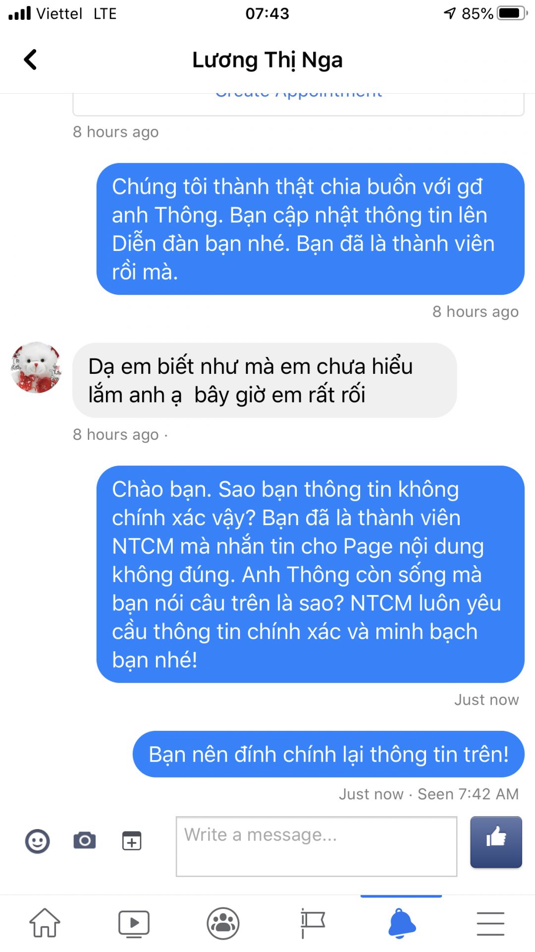 Tin nhắn của Page NTCM nhận được thông tin từ bạn Lương Thị Nga, nội dung như sau: