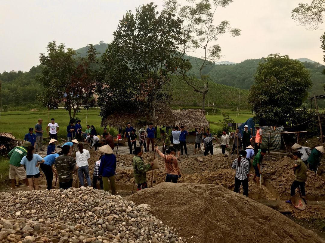 Sáng nay, nhà bà Huyệt hoàn thành công việc cúng động thổ, sự tham gia đào móng của hơn 60 phụ nữ và đoàn thanh niên. Ngoài ra, anh Khương, chủ doanh nghiệp khoáng sản trên Tuyên Quang tài trợ 20 khối sỏi san nền trị giá 6 triệu đồng.