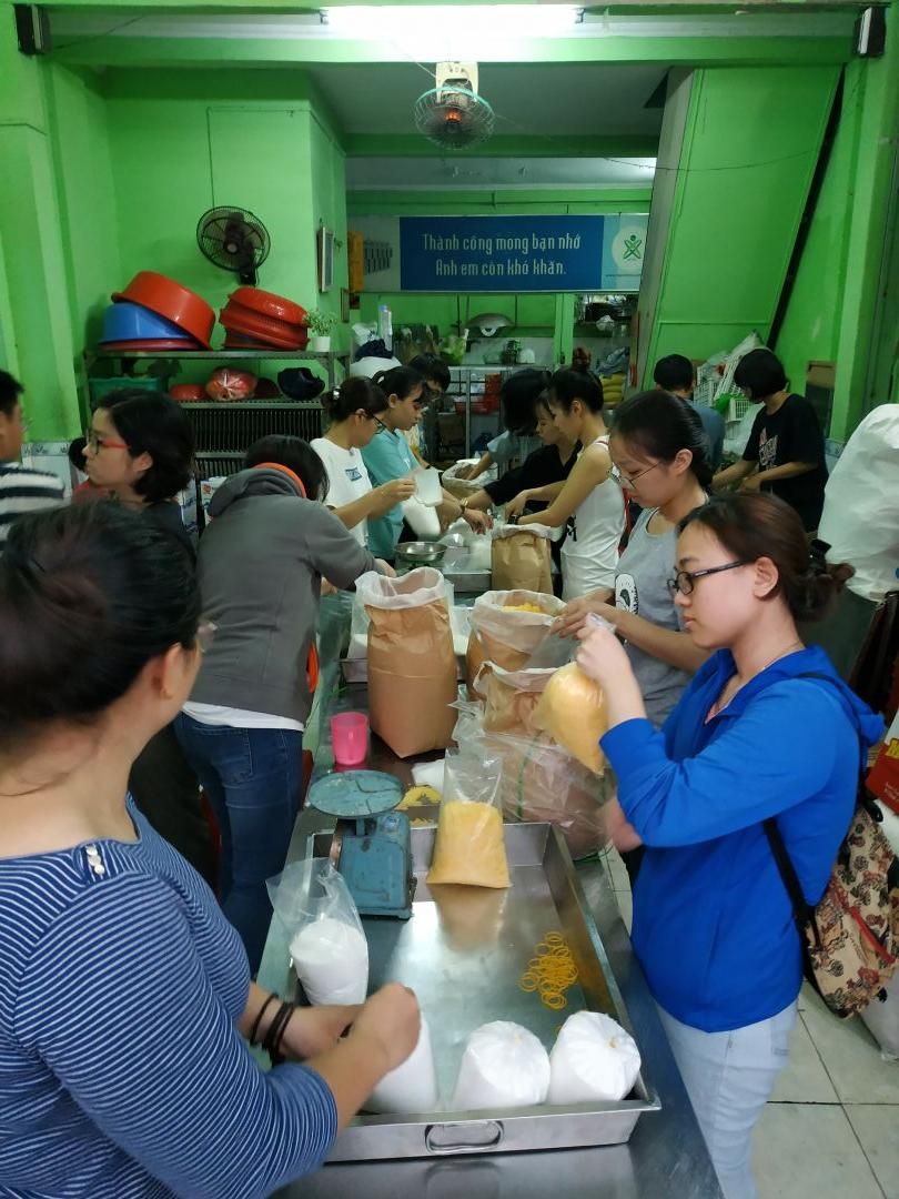 Chị Nghĩa cùng chị Hạnh TV ở quán cơm ủng hộ thêm cho chương trình Trung Thu Đăk khâu gấu bông và thun cột tóc .