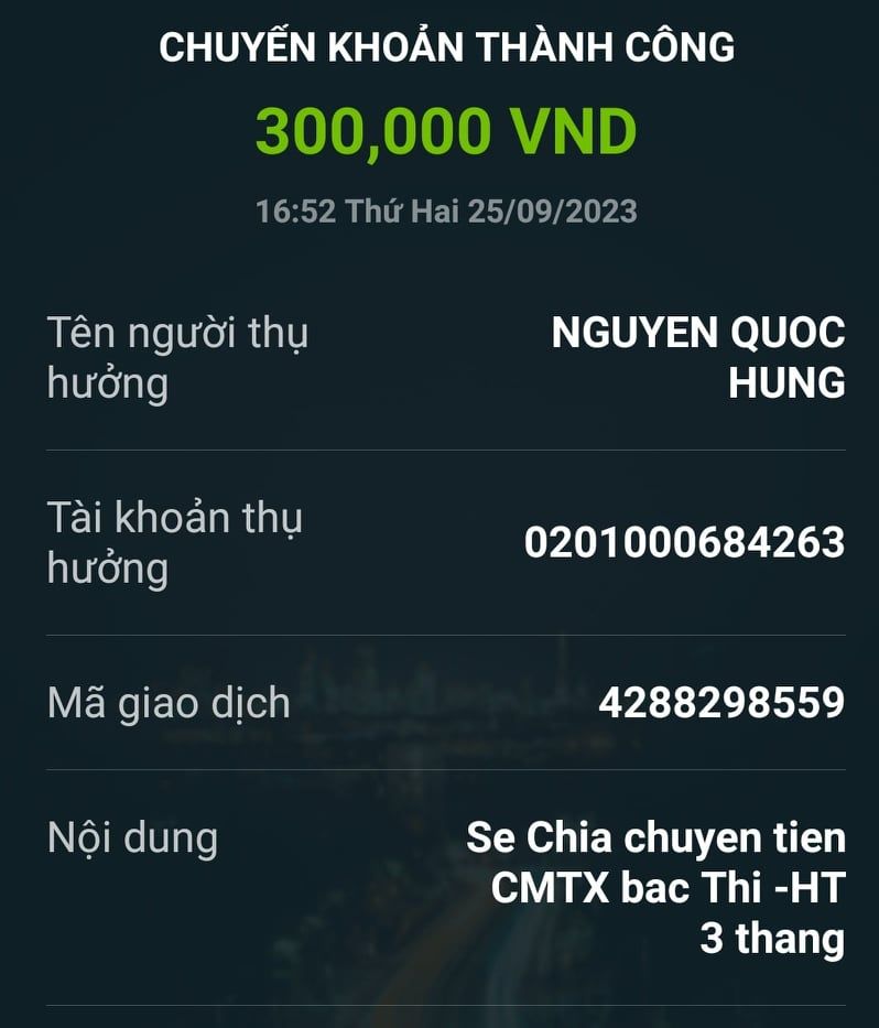 @trangvitgioi : Em xuất quỹ chuyển tới bác @Lắng nghe lòng bạn 600,000₫ tiền CMTX bác Thỉ trong 3 tháng kể từ tháng 9/2023 nhé.