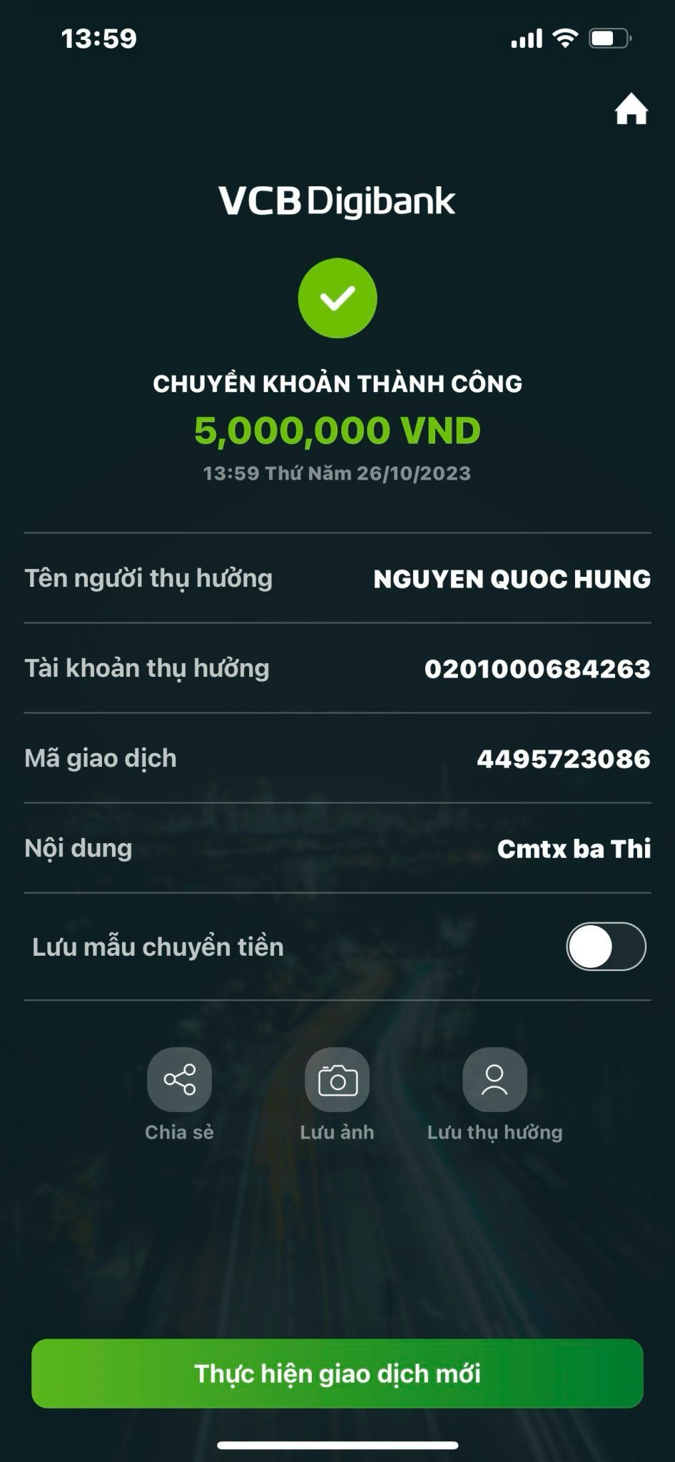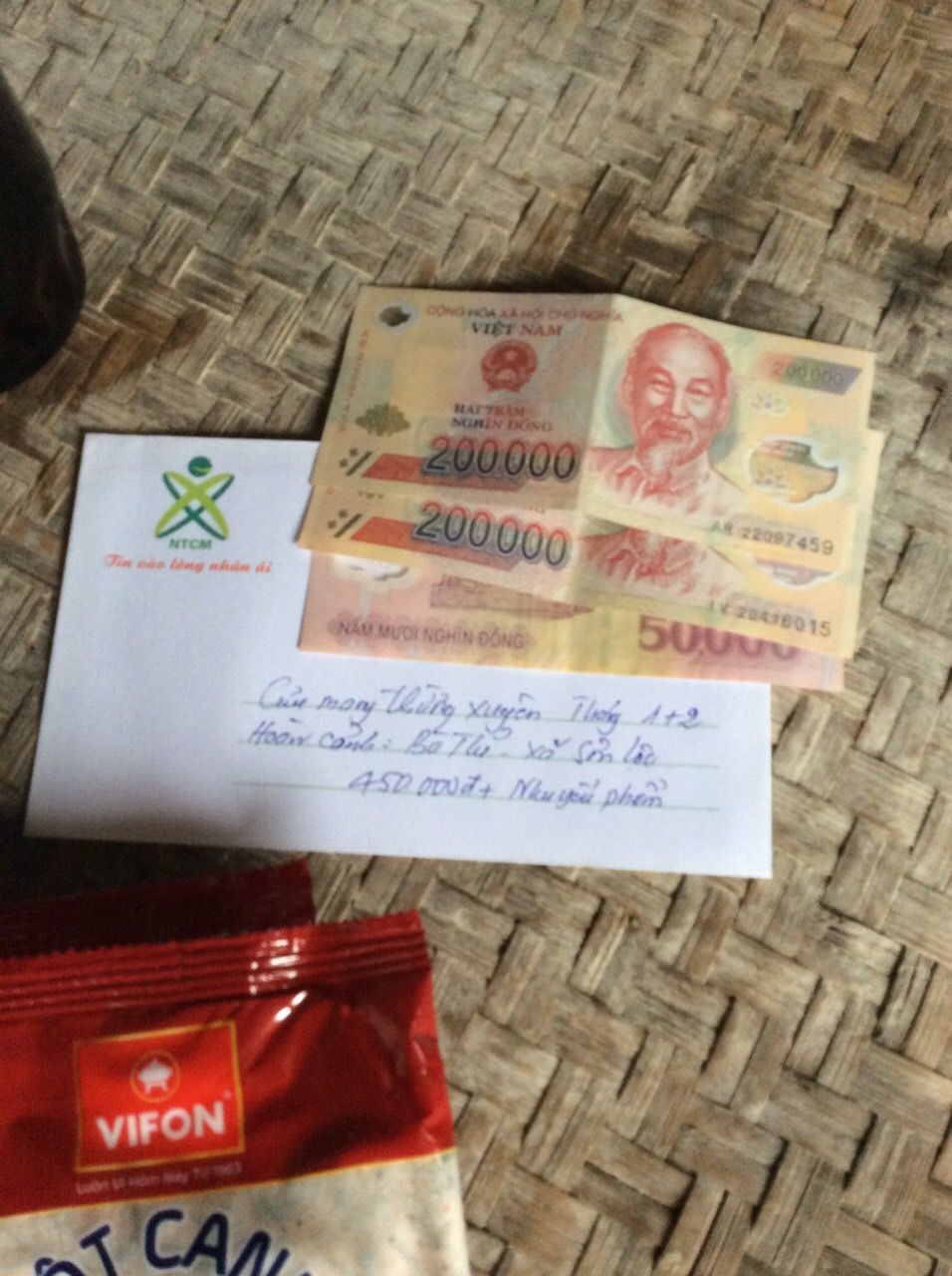 Số tiền 5tr VND đã chuyển trước cho anh Hùng để trao dần tới bà Thỉ ạ.