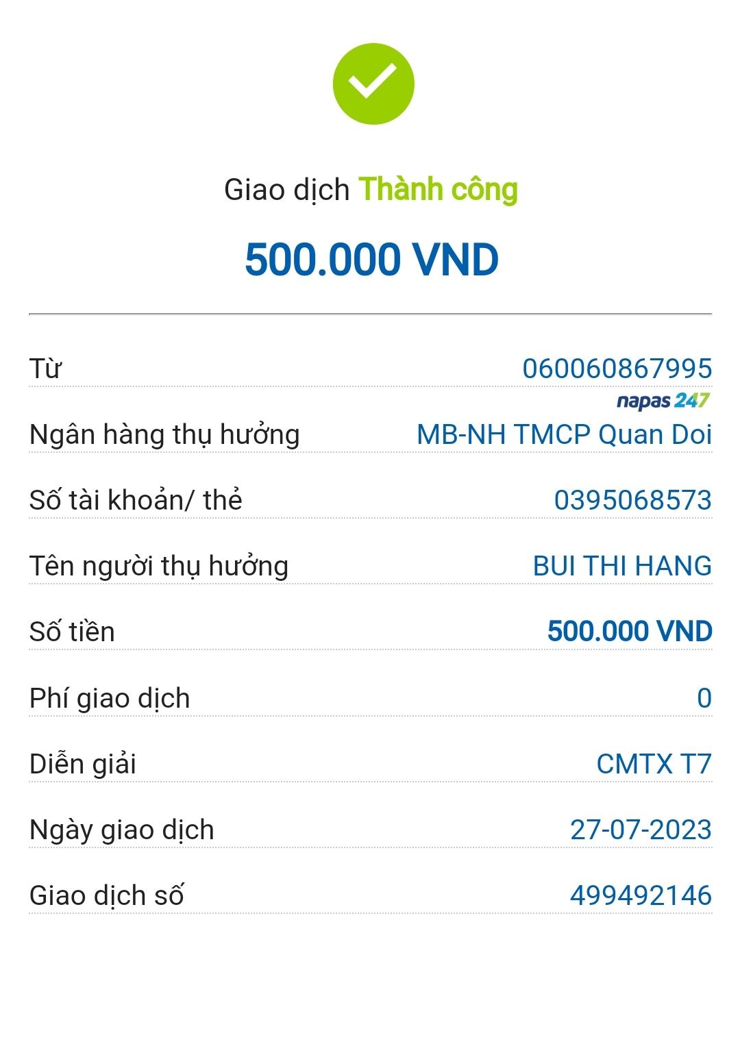 Bạn Ngân Nguyễn vẫn tiếp tục giúp các cháu Hằng & Châu và đã chuyển tiền CMTX tháng 7/2023 trực tiếp cho cháu Hằng các bạn nhé.