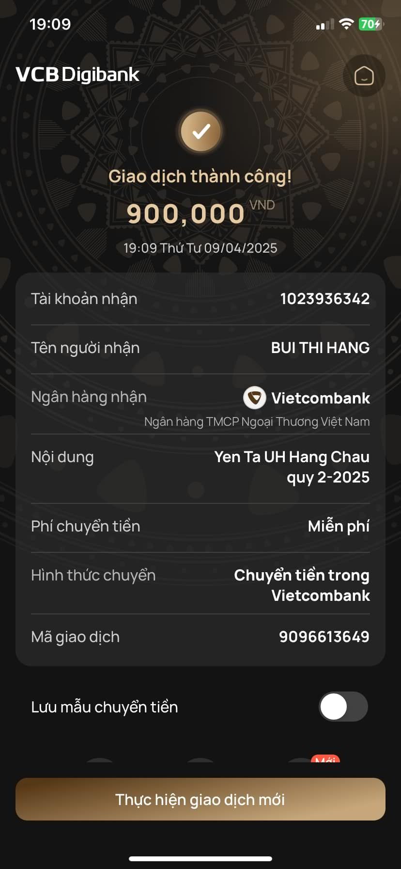 Cô đã chuyển tiền hỗ trợ quý 2/2025 tới tài khoản của Hằng. Chúc hai chị em luôn mạnh khoẻ và học tập tốt!