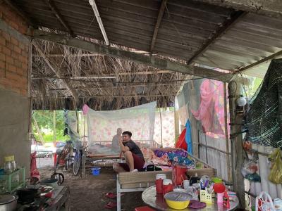 Trước đây gia đình anh được xây nhà tình thương với diện tích khoảng chừng ngang 4,2m và dài 7m. Với diện tích này nhỏ nên gia đình ở ngoài, mình có nói anh Sanyo tuy nhỏ nhưng đưa mẹ tạm vô nhà mà ở đi còn con cháu tạm ở ngoài cũng được vì hiện nay cô Nửa, vợ chồng anh Sanyo cùng con trai đầu học lớp 12 còn cháu gái thứ 2 ngủ trong nhà.