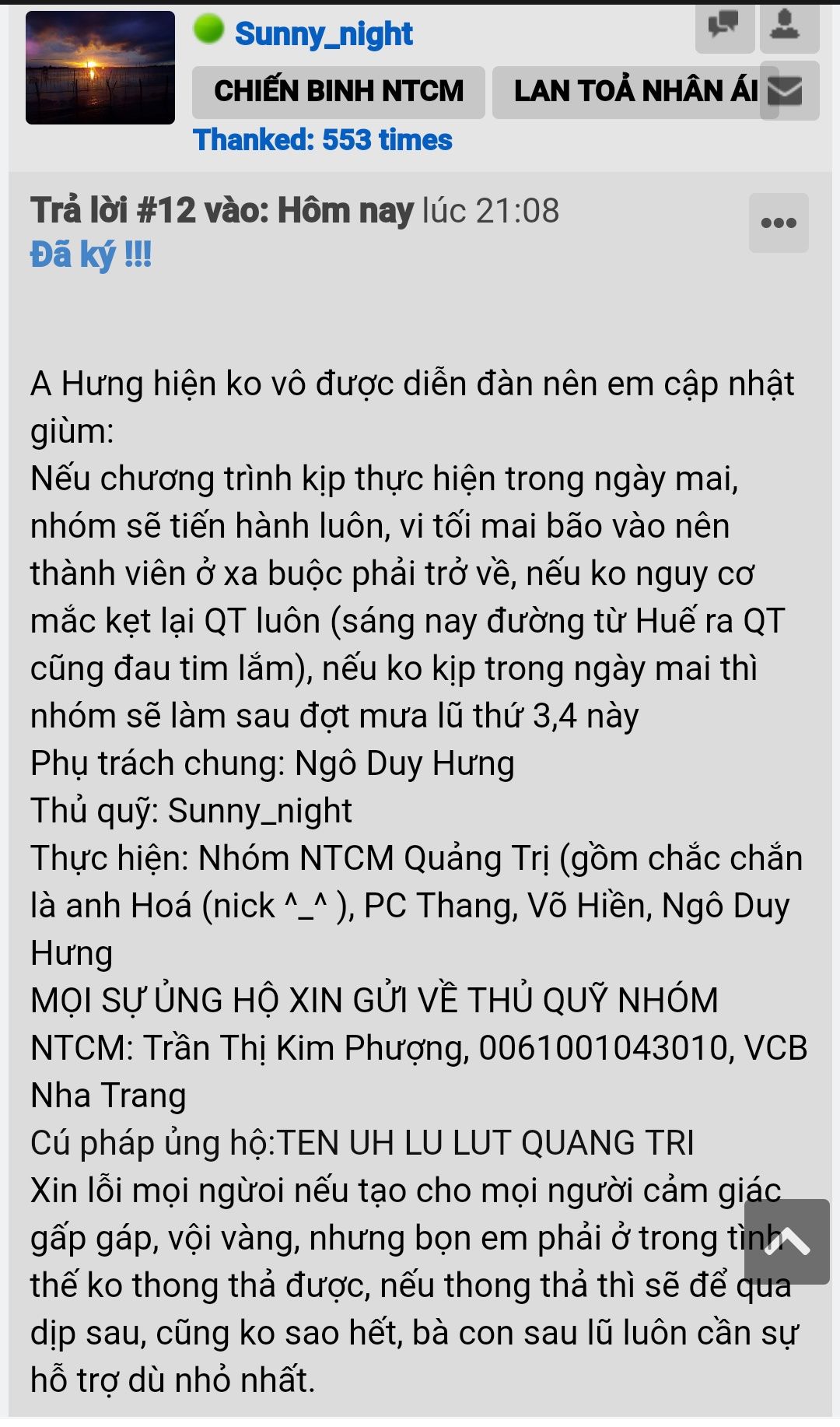 MỌI SỰ ỦNG HỘ XIN GỬI VỀ THỦ QUỸ NHÓM NTCM: Trần Thị Kim Phượng, 0061001043010, VCB Nha Trang