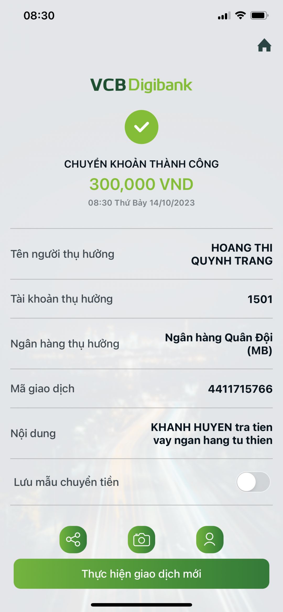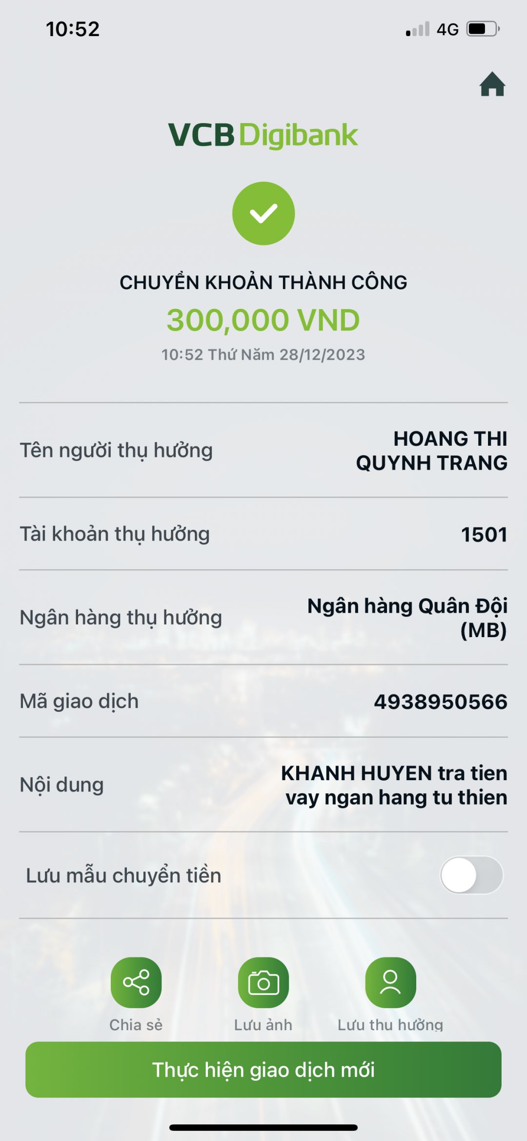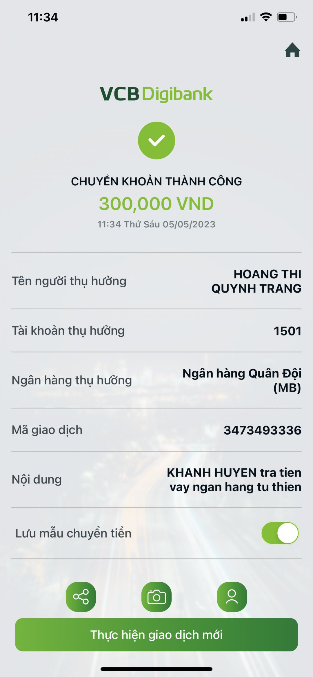 Hiện Khánh Huyền đã đi làm thêm nên em xin được trả dần số tiền MTQ đã cho em vay trong quá trình học vừa qua