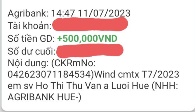 Con là Vân, con đã nhận được số tiền 500.000đ trong tháng 7 từ sự giúp đỡ của cô Wind cmtx ạ. Con và gia đình con cảm ơn tấm lòng của cô Wind cũng như cô Trang và các cô chú mạnh thường quân nhiều ạ. Con sẽ cố gắng học tập thật tốt để không phụ lòng giúp đỡ của các cô chú ạ.