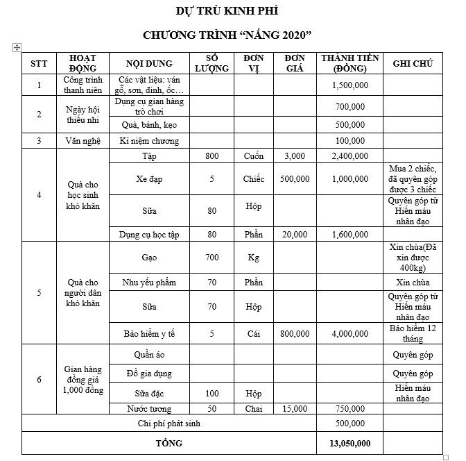 Dự trù kinh phí và hình ảnh của chương trình có tại: https://drive.google.com/drive/folders/1_1TJsC5F2Q7Rhezn8CNvOR24Y7b3NANs?usp=sharing