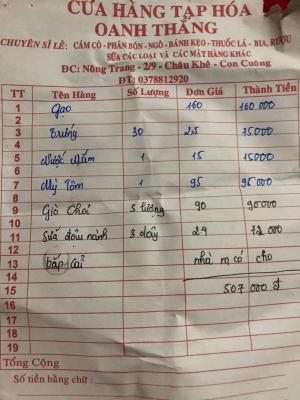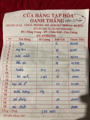 Hoàn cảnh bà xuân, tháng này tụi con đã qua thăm bà, tụi con có mua mì, gạo, nước mắm, trứng gà...., và một 5 lượng dò( vì thịt tầm này vẫn còn đặt nên lần sau giá rẻ hơn tụi con sẽ mua thịt), bắp cải thì nhà có nên tụi con mang theo qua cho bà nấu. Tụi con xin gửi hoá đơn đã mua cùng một số hình ảnh để cả nhà cùng nắm rõ. Con và các TV Nghệ An xin cảm ơn tấm lòng của những người đã dang rộng vòng tay ấm cưu mang các hc khó khăn các cụ neo đơn già cả ở Nghệ An. Chúc cả nhà luôn thật nhiều sức khoẻ, bình an, hạnh phúc!