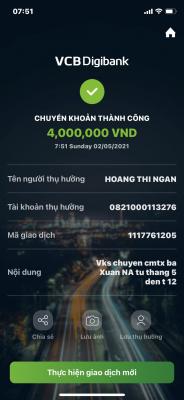 Con chào cả nhà , tụi con xin cảm ơn anh Thai Dzuy và Chị Việt Đỗ đã chung tay để giúp hoàn cảnh mẹ con bà Xuân . Tụi con sẽ cố gắng thực hiện như mong muốn của anh Duy sẽ nhận 500k mua nhu yếu phẩm và hạn chế trao tiền mặt cho hoàn cảnh của của bà , tuỳ vào thời điểm tụi con thấy như thế nào phù hợp sẽ cân nhắc vào trao ạ . Tụi con sẽ báo cáo hoá đơn và báo hình ảnh cụ thể để cả nhà nắm được tình hình của gia đình bà . Và hoàn cảnh bà @Hoàng Ngân đã nhận sẽ chịu trách nhiệm ạ . Số tài khoản của Hoàng Ngân , bqt diễn đàn đã có nên ban điều phối chuyển tiền cưu mang cho em í để sắp xếp trao cưu mang hàng tháng . Con cảm ơn cả nhà đã chung tay.