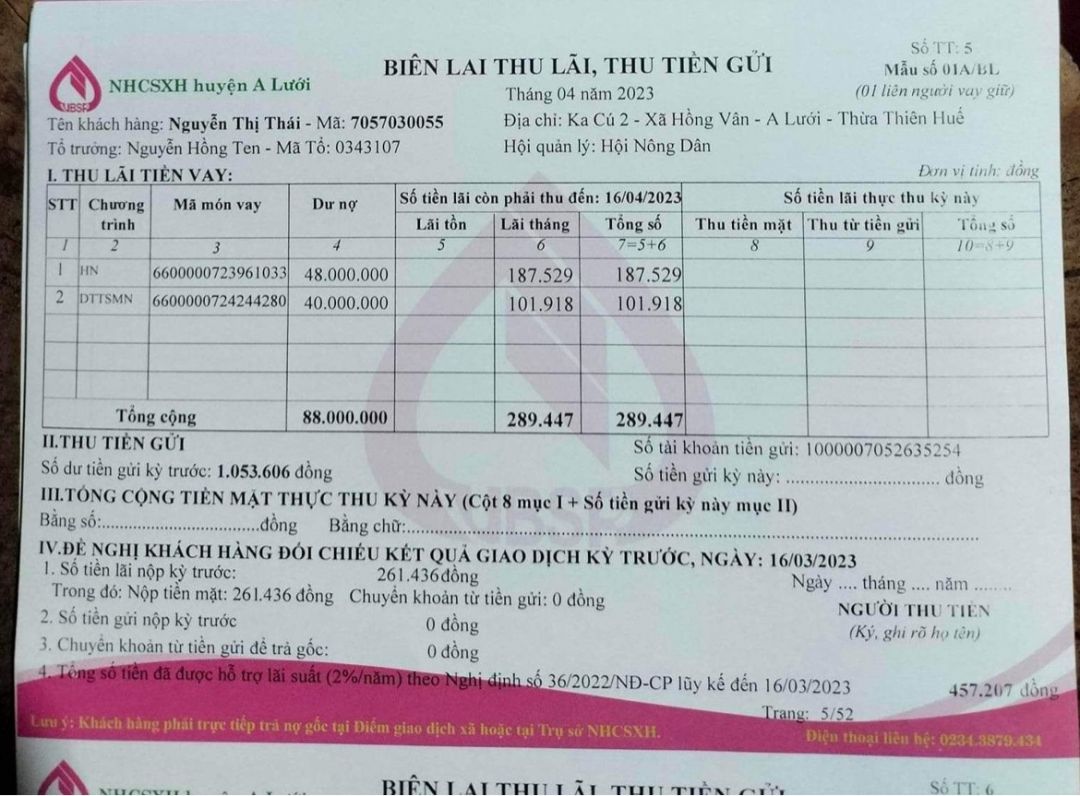Theo thông tin e cập nhật từ cô Thái thì số tiền còn nợ vay ngân hàng nông nghiệp là 194,500 đồng chẵn, vay chính sách là 88 triệu, còn tiền vật liệu ở ngoài là 19,295 nghìn đồng chẵn và nợ khác nữa, về thuốc hai cháuuống đi mua thuốc một lần nhưng vì kinh tế khó khăn nên em
