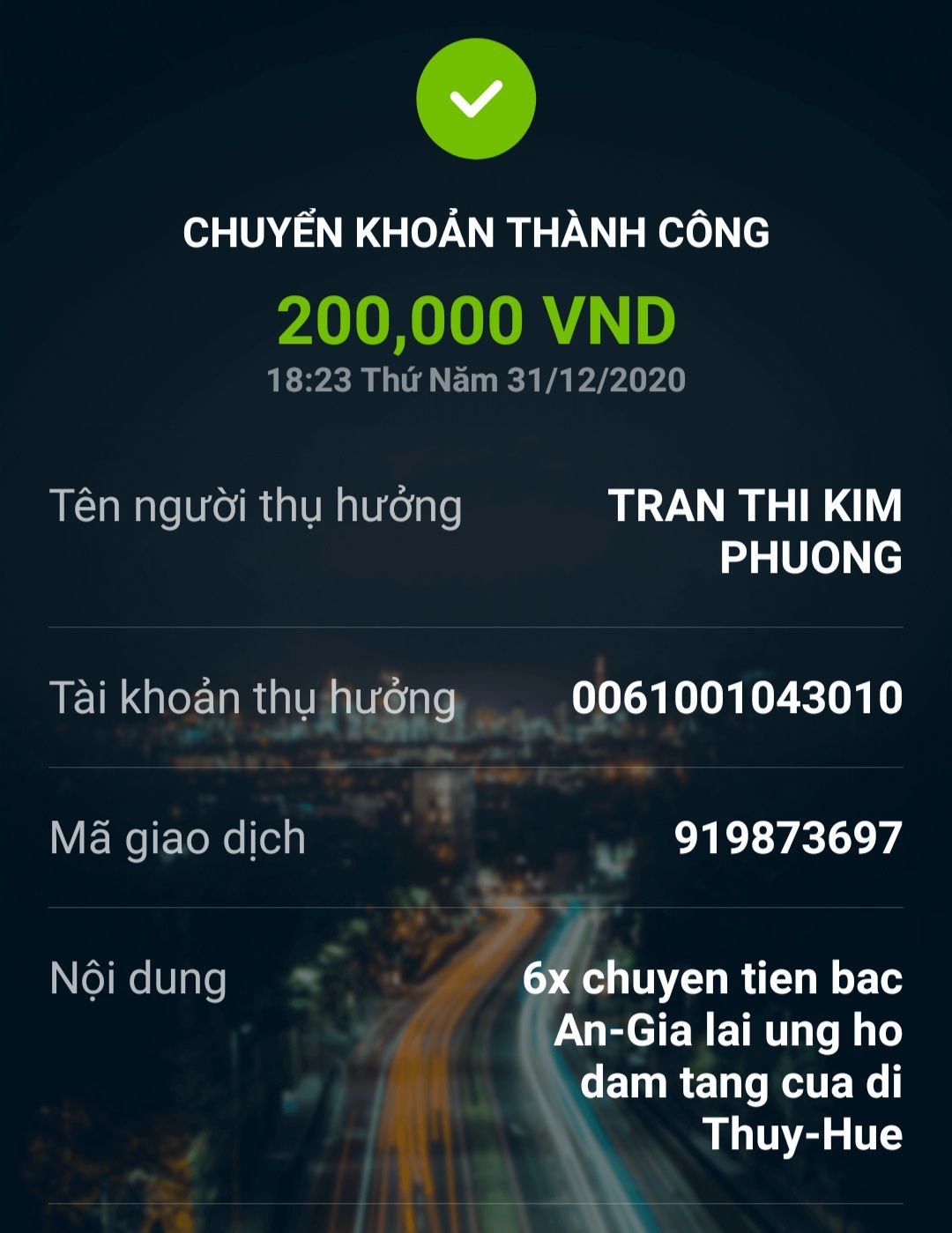6x đã chuyển tiền bác An - Gia Lai ủng hộ đám tang của dì Thủy về thủ quỹ Thocon rồi các bạn nhé.