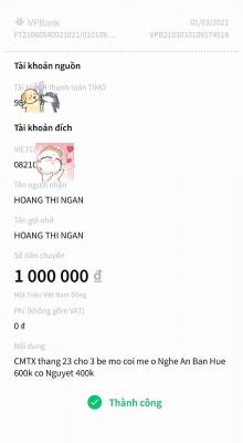 Loanngyen chuyển 1,000,000đ tiền CMTX tháng 2,3 từ bạn Hue (600k) và cô Nguyệt (400k) cho 3 cháu, nhờ Ngân chuyển cho gia đình giúp nhé. Tks em !