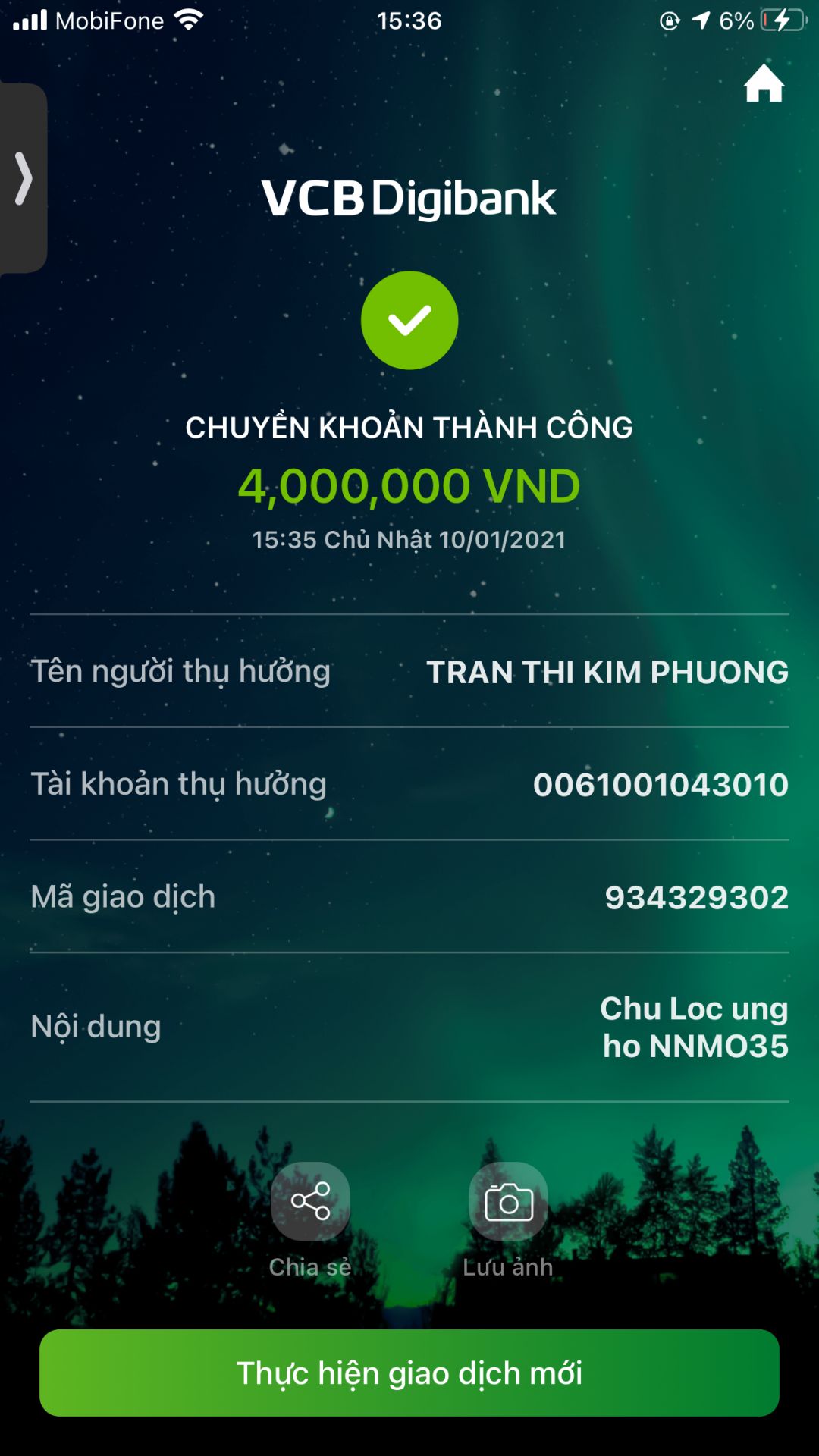 Chú Lộc ủng hộ NHMO số 35 4 triệu. Em đã chuyển khoản vào quỹ.