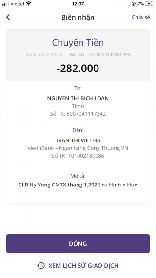 Loannguyen đã chuyển 282,0000đ CMTX tháng 02/2022 (ghi nhầm tháng 1) từ CLB Hy Vọng đến chị Hà, nhờ nhóm chuyển giúp đến cụ Hinh nhé.