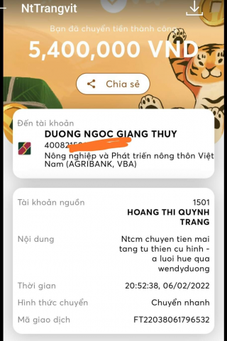 Dạ! Chuyển đến Wendy Duong ah. Bạn ấy sẻ nhắn tin số tk vào số điện thoại của Bác Sáu.