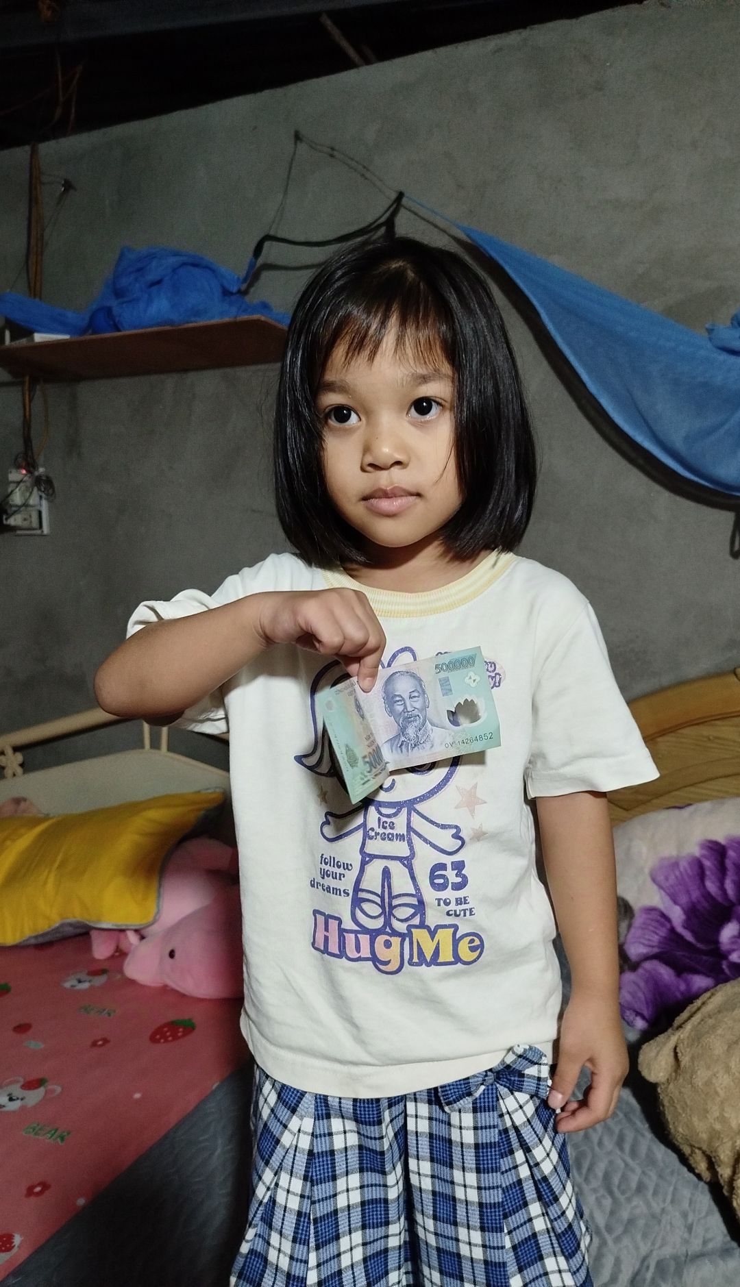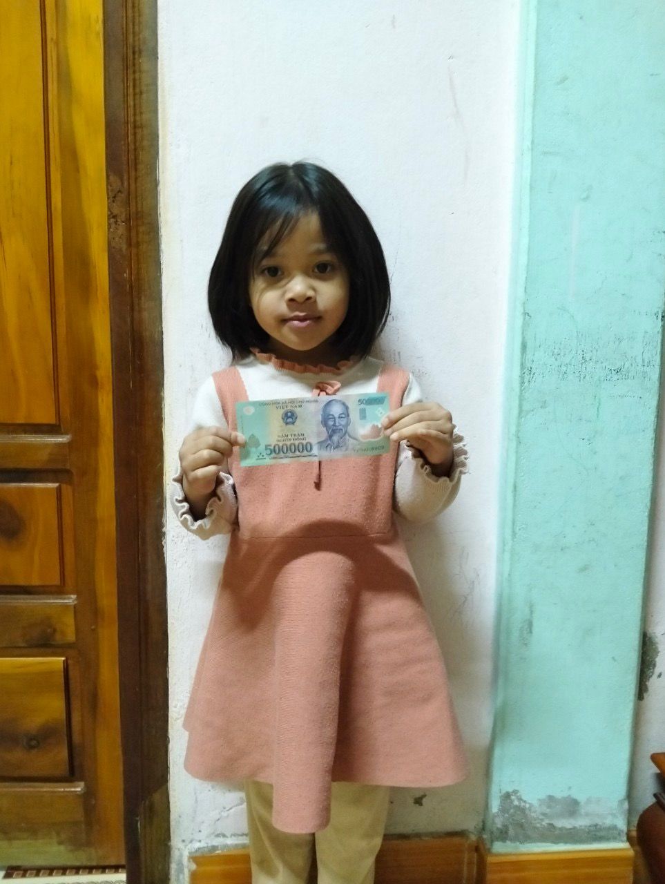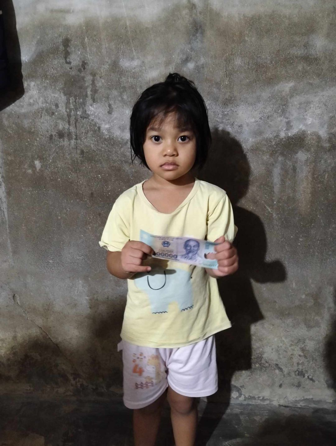 Em đã trao 200.000 đ tới cháu Khánh Băng. Theo thông tin từ mẹ cháu, hiện cháu đã đi học mẫu giáo lớn, nhưng phải đem theo nhiều quần nhờ các cô hỗ trợ thay vì đi ngoài lắc nhắc mất kiểm soát. Cháu vẫn phải uống thuốc hàng tháng theo đơn và đa số mua ngoài do điều kiện đi viện xa nên không đi đều được.