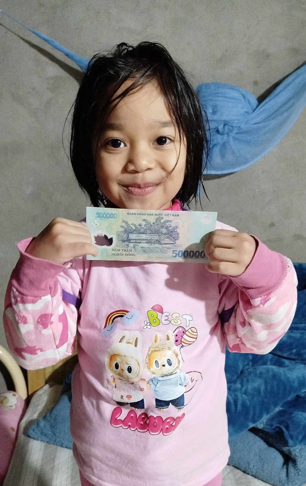 Em đã trao 200.000 đ tới cháu Khánh Băng. Theo thông tin từ mẹ cháu, hiện cháu đã đi học mẫu giáo lớn, nhưng phải đem theo nhiều quần nhờ các cô hỗ trợ thay vì đi ngoài lắc nhắc mất kiểm soát. Cháu vẫn phải uống thuốc hàng tháng theo đơn và đa số mua ngoài do điều kiện đi viện xa nên không đi đều được.