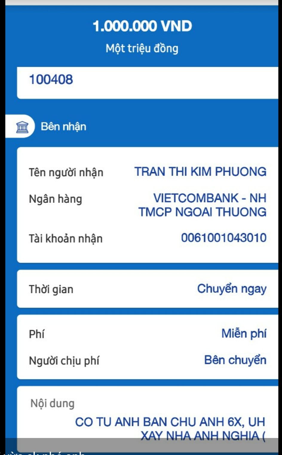 Gd VĩnhPhuc gửi phần nhỏ Uh xay nha A Nghia đã ck về tài khoản thủ quỹ.