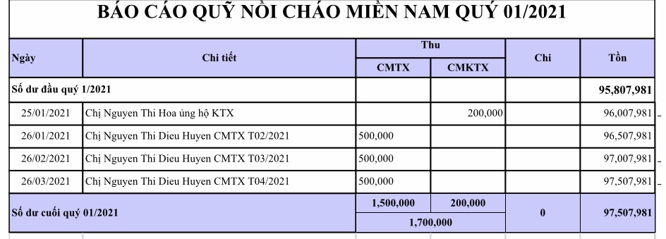 Gửi cả nhà BC Quỹ Nồi Cháo Miền Nam quý 1/2021. Hiện tại do nồi cháo tạm ngưng hoạt động, không phát sinh chi phí chỉ có một số khoản ủng hộ nên Loanngyen làm BC theo quý, khi nào nồi cháo hoạt động lại sẽ điều chỉnh BC theo tháng.