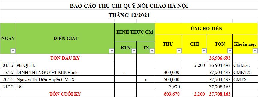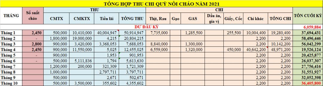 Toàn bộ các chỉ tiêu thu, chi đều tăng so với cùng kỳ năm ngoái, do tăng số buổi nấu cháo từ 4 buổi (năm 2020) lên 22 buổi (năm 2021).