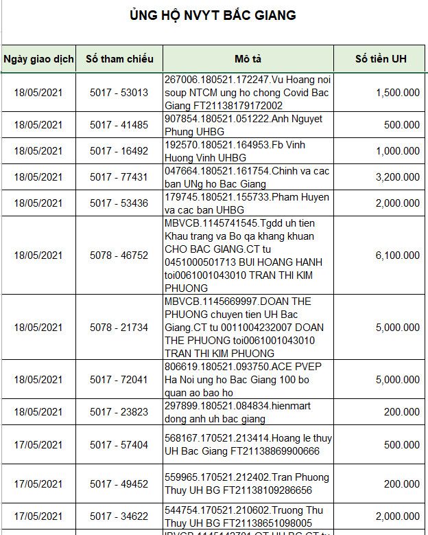 Chị Maitan97 nói bạn phụ trách thống kê báo cáo cập nhật bản ủng hộ kinh phí cho Bắc Giang để BQT có căn cứ duyệt chuyển giữa các chương trình (Bắc Giang sang Điện Biên) nhé.