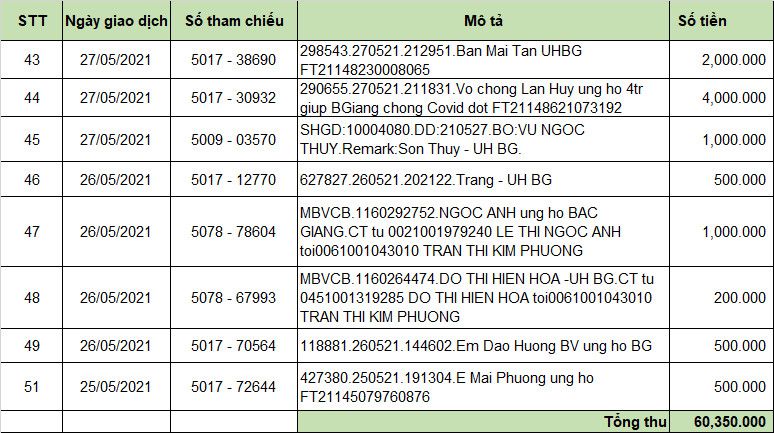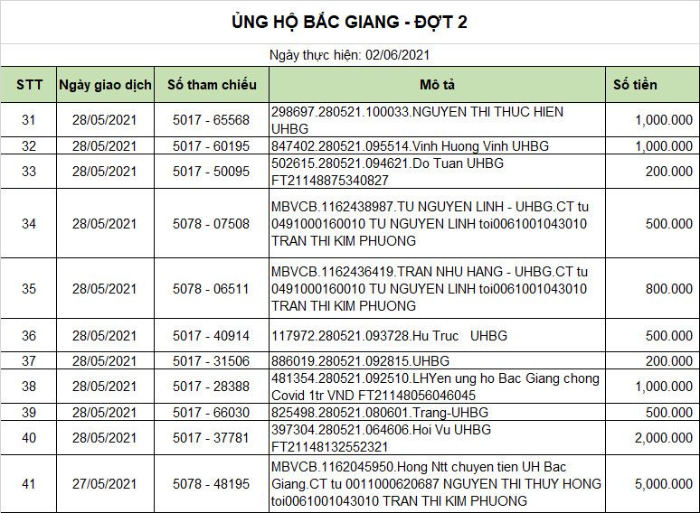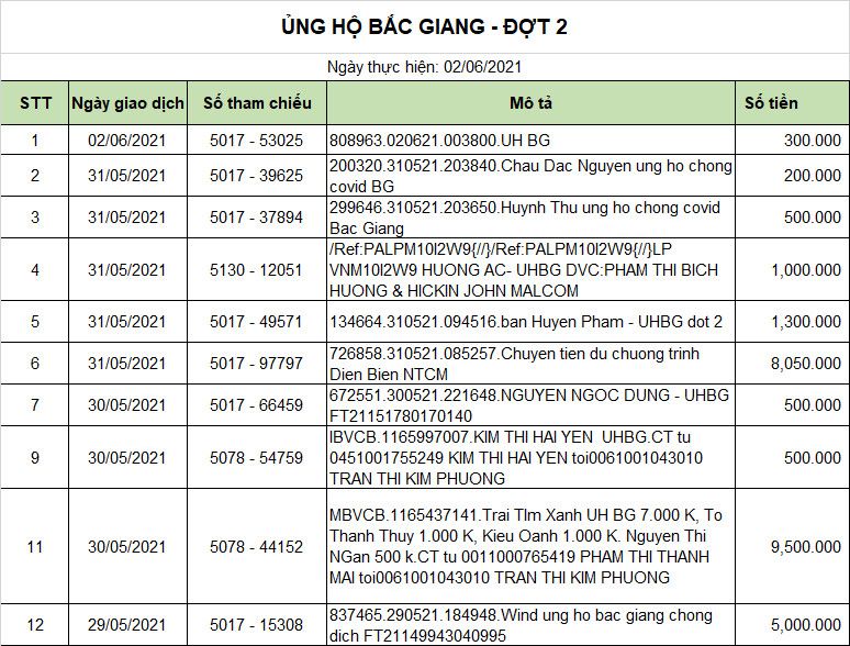 • Theo thống kê đến 21.00 ngày 2.6.21 số tiền ủng hộ cho Bắc Giang đợt 2 (bao gồm 8.050.000 đ từ chương trình UHNV YT Điện Biên chuyển sang) là  60.350.000 đ