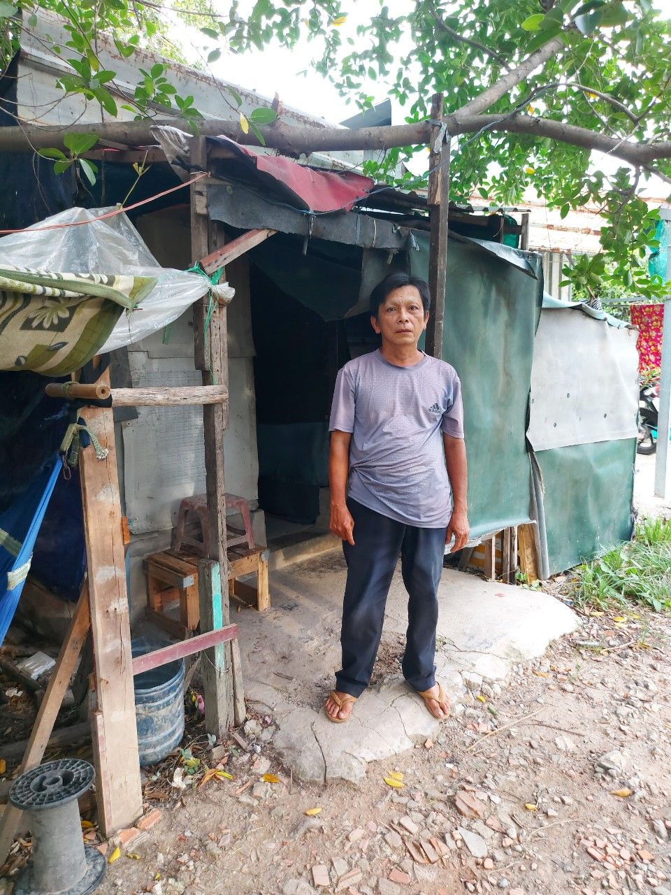 Hiện tại Chú Vui ở đậu trên đất người ta. Địa chỉ này Tuyền xin từ chị hàng xóm ở gần đó Ấp 5 E 11 xã bình Hưng Bình Chánh.